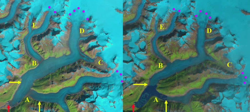 Field Glacier in Landsat images from 1997 and 2017 illustrating lake development, glacier separation at Point A and B and progressive detachment/separation at Point C,D and E.