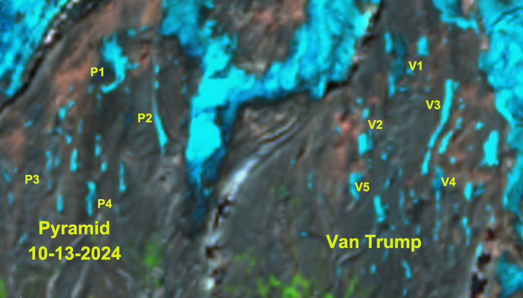 Van Trump (VT) and Pyramid (P) Snowfields Oct. 19, 2022 false color Sentinel image. VT1 and P1 are the largest at ~0.046 and 0.048 km² respectively.
