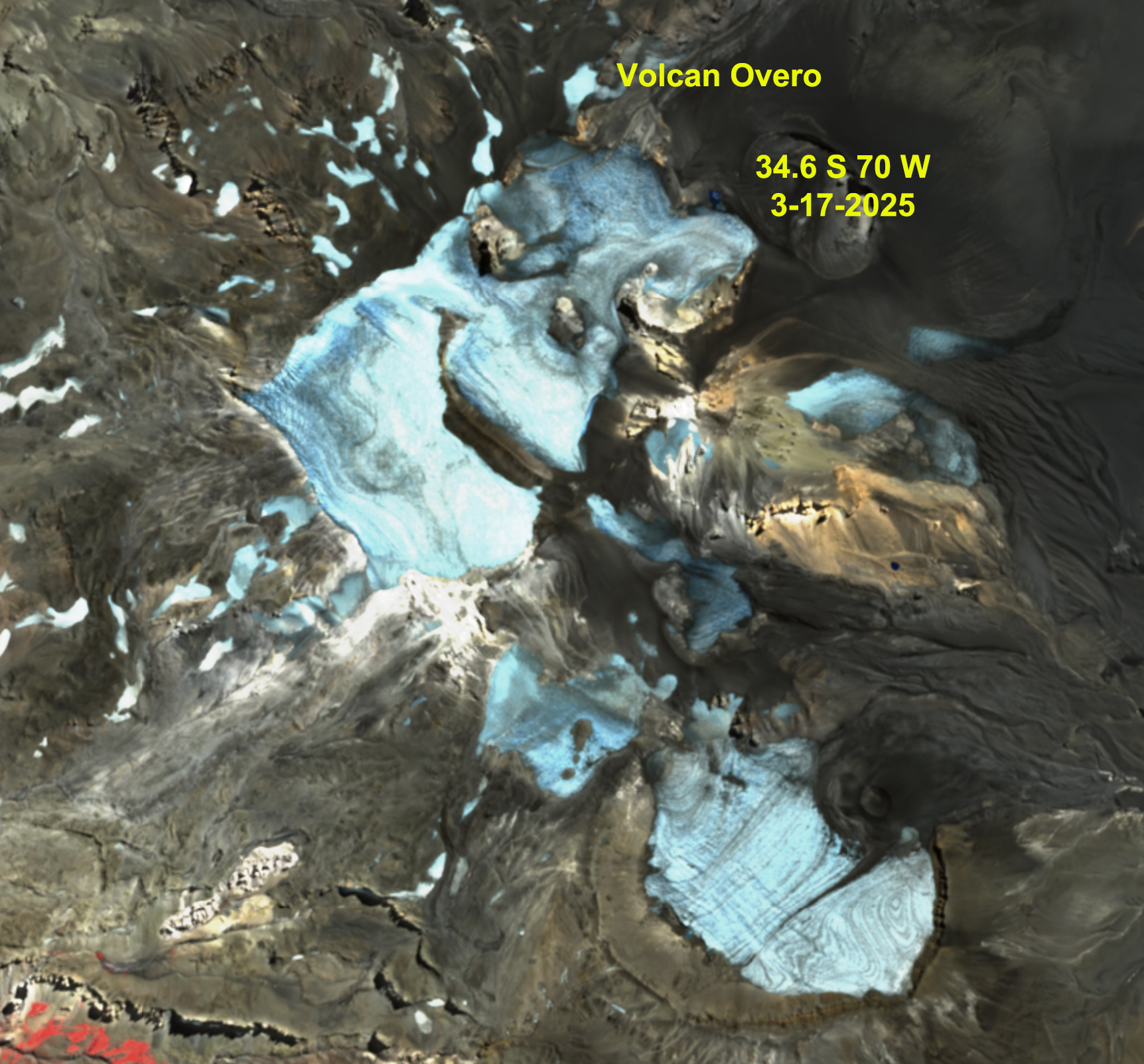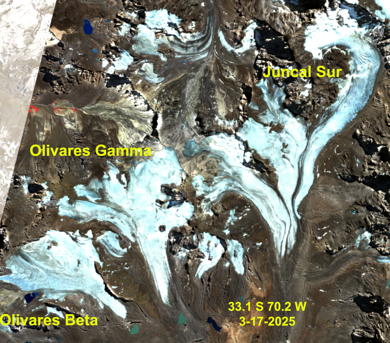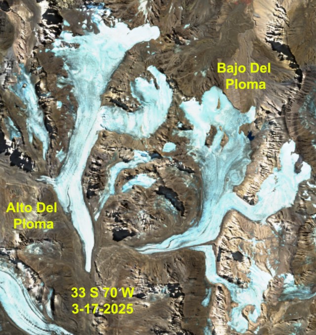 For an alpine glacier to thrive it must remain 50-60% snowcovered throughout the year, even at the end of the summer. To survive it must have consistent significant snowcover at the end of summer, indicative of a persistent accumulation zone (Pelto, 2010). In the Central Andes of Argentina and Chile I have chronicled the near total loss of snowpack, leading to dirty/dark snowcover free glaciers. in 2022 and 2023 (Pelto, 2023). In 2025 this pattern is again apparent. From north of Santiago at Olivares Glaciers and Alta/Baja de Plomo Glacier to east of Santiago at Volcan Overo adn Fiero Glacier to south of the Santiago region at Cobre Glacier and Volcan Peteroa we see glaciers in mid-March with less than 10% snowcover remaining. This is indicative that the 2024/25 mass balance period for the Central Andes will be one of significant loss.