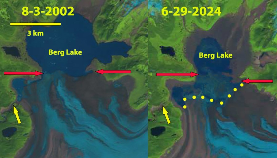 During the 1986-2022 period the full lake level declined, but the filled area of the lake remained close to 25 km2. The lake level decline led to abandonment of the gorge outlet and drainage south into Lake Ivanov (NWS, 2024). In 2019 this channel was also abandoned, and now the drainage goes directly from Pacman Lake into the Gandil River and then into the Bering River watershed (NWS, 2024). The rapid retreat of Steller Glacier terminus particularly on the western half of more than a kilometer from 2016 to 2018 has driven the continuation of outlet location shift. The speed of drainage from 2018-2021 caused significant flooding in the floodplain of the Bering and Gandil River, that has not been observed in 2022-2024.