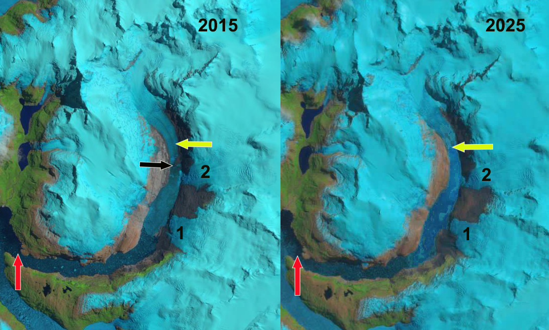 In 1985 the HPS-12 terminates 1.5 km from the junction of two fjords that are occupied by HPS-12 and HPS-13. These are separated by a peninsula. The glacier is fed by four tributaries labelled 1-4. The snowline in 1985 is at 900 m. In 2001 the four tributaries still join the main glacier, but the terminus has retreated 3.5 km. In 2015 glacier retreat has led to separation of tributary 1, 2 and 4 from the main glacier, tributary 3 only feeds tributary 2 and not the main glacier. The glacier retreat has continued to 2017, the current terminus is 800 m wide vesus 2800 m wide in 1985 . Total retreat from 1985 to 2017 was 13 km. By 2025 the glacier has retreated 14.75 km and has lost more than 50% of its total length. Tributary 1 and 2 continue to narrow from 2015 to 2025 illustrating that flow from the icefield accumulation zone is being reduced. This suggests less discharge into the terminus reach of HPS-12.