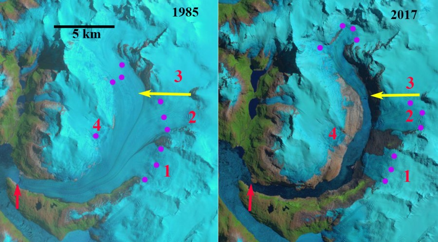 HPS-12 Glacier in 1985 and 2017 Landsat images. The red arrow indicates 1985 terminus, yellow arrows the 2017 terminus, purple dots the snowline and 1-4 are tributaries. By 2017 all tributaries have detached and the glacier has retreated 13 km.