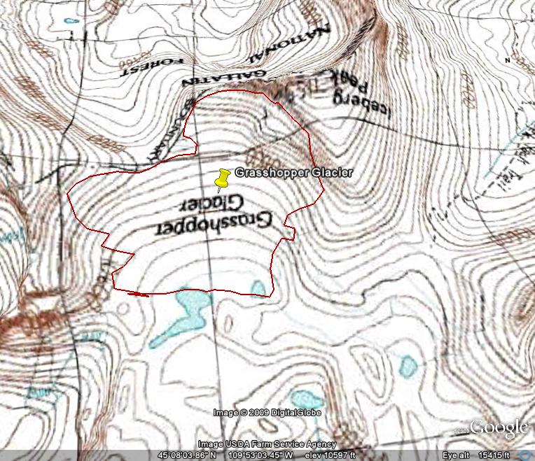 Grasshopper Glacier, Montana is in the Beartooth Range in Custer National Forest. The glacier occupies a north facing cirque at nearly 3300 m on Iceberg Peak (11,000 ft.). The name of the glacier is derived from the millions of grasshoppers that were discovered embedded in the ice in 1898 by Dr. James Kimball. He estimated their were thousand of tons of grasshoppers in the ice. Nearly a century later some of these grasshoppers were extracted from the glacier and using radiocarbon dating scientists the remains of these grasshoppers finding they had been trapped in the 1300s (Sutton et al, 1996). These grasshoppers either were downed by a sudden storm or were carried over the glacier by strong winds aloft, and then cold forced them onto the ice surface. The grasshoppers are an extinct type of Rocky Mountain grasshoppper Melanoplus spretus (Lockwood et al., 1992)