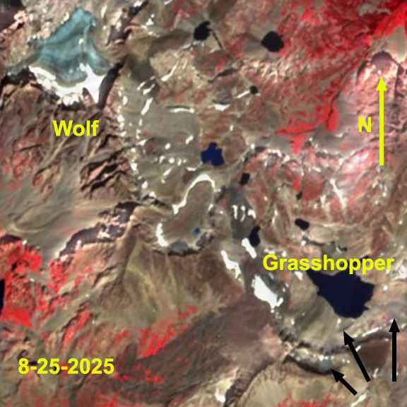 The glacier has continued its rapid recession and the further segmentation into small disconnected segments, heralds the end this glacier. We do have a gorgeous new alpine lake in its place. Notice the basin is still largely devoid of plant life, which is red in this false color image. The surface still has the color of newly exposed-deposited sediments. It is interesting that the glacier was named for a type of grasshopper that went extinct in the late 1800s in conjuction with the expansion of farming in the midwest, that disrupted their life cycle. Now the glacier is gone due to the warming climate from our increased production of carbon dioxide.