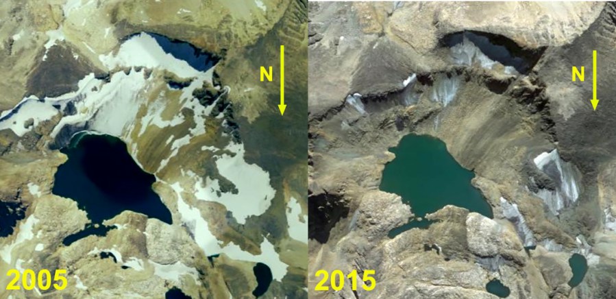 By 1994 the area had decline to 0.26 km2. The bench between the upper and lower section of the glacier is emerging and the lake has expanded to 0.08 km2.