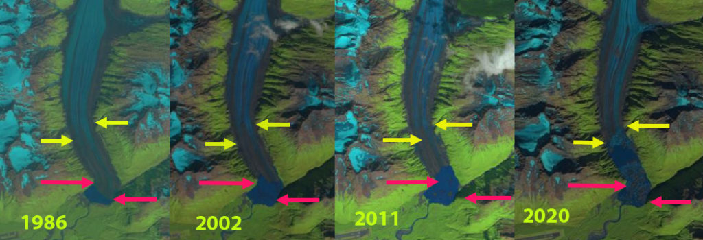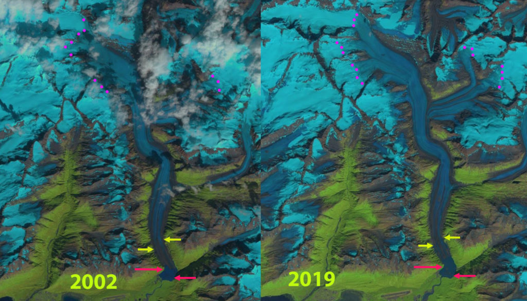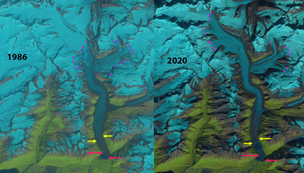 In 1984 the terminus location is denoted with red arrows it has separated into two termini on either side of “Prow Knob”. The northern terminus tongue is located on a narrow island on the north side of Alsek Lake. The southern tongue merges with the northern arm of Grand Plateau Glacier in 1984. Two tributaries at the pink arrows merge with the main glacier. By 1999 the northern tongue has retreated from the narrow island, which exposes the terminus to enhanced calving. The southern terminus has separated from the Grand Plateau Glacier. By 2013 the northern terminus has retreated to the northern end of “Prow Knob” and the southern terminus is directly south of “Prow Knob” in a 1.8 km wide channel. By 2018 two tributaries of Alsek Glacier are fully detached from the glacier, pink arrows. In 2018 the northern terminus tongue has retreated 3.7 km since 1984 into the 2.0 km wide channel on the northeast side of “Prow Knob”. The center of the southern terminus has retreated 2.5 km since 1984 and remains in the channel on the south side of “Prow Knob”. The length of the calving front has declined from an 8 km long calving front in 1984 to a 4 km calving front in 2018. By 2021 further retreat has led to a 2.8 km wide calving front, and a 1.6 km long contact with Prow Knob. From 1984-2022 the retreat and loss of area has been: 4.3 km and 8.6 km2 respectively for the northern terminus, 2.7 km and 5.1 km2 for the southern terminus and 7 km and 13.1 km2 for the northern arm of Grand Plateau Glacier.