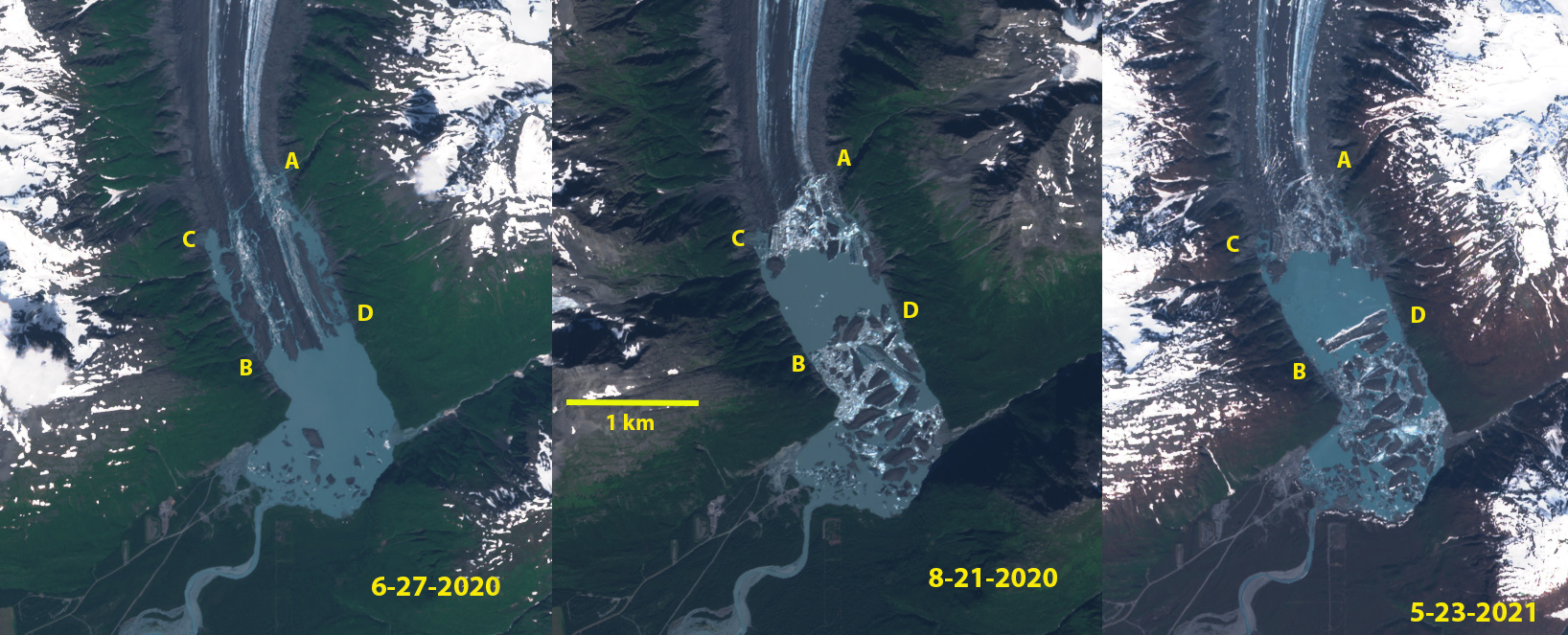 Alsek Glacier retreat from 2018-2021 in Landsat images. Red arrows mark the 1984 terminus location, yellow arrows the 2022 terminus location, pink arrows indicate tributary separation, AR=Alsek River, GP=Grand Plateau, PK=Prow Knob, G=Gateway Knob, A=glacier junction, B=tributary separation, C=tributary separation, D=tributary confluence.