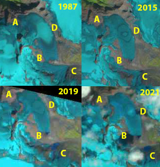 East Creek Glacier a Braithwaite Icefield glacier in Landsat images from 1987, 2015, 2019 and 2021 illustrate the changes. Point A and B are points where the glacier is connected to other glaciers of the icefield that separate-fragment during this period. Point C is a the terminus of one icefield outlet glacier that develops a proglacial lake. Point D is adjacent to the ice divide where ice flows both north and south from. Note the area is snow free in 2015, 2019 and 2021.