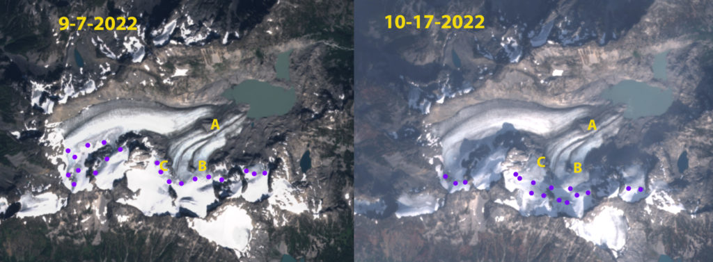 Icemantle Glacier in early September, when snow melt is usually largely offset by occassional new snowfall, and mid-October 2022 after a month of continue ablation reduced snowcover significantly. Notice the expansion and emergence of bedrock at Point A-C.