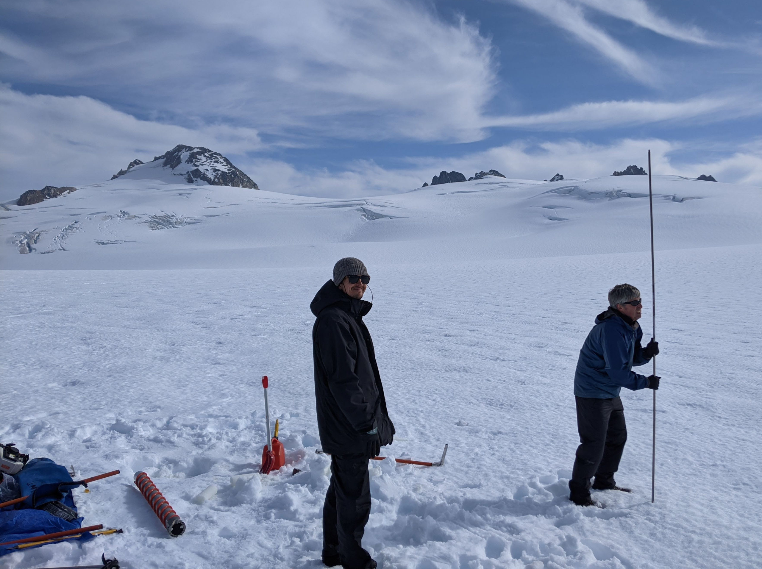Brain Menounos, UNBC probing snowpack on the upper glacier. Searching for a potential measurement station high on the glacier (Image from Ben Pelto).