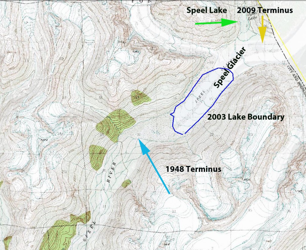 In 1948 Speel Glacier ended at the head of a braided outwash plain, generated by the Speel River. Upglacier in 1948 there was a small side valley lake impounded by the glacier, Speel Lake. The lower part of the glacier was heavily debris covered and stagnant in 1948. I In the 1984 Landsat image the glacier had retreated 3 kilometers from the 1948 position and was fed by four separate tributaries flowing into the glacier A-D. n 1984 the original Speel Lake had drained and a new lake had formed filling the valley that the glacier had filled in 1948. The proglacial lake was 2.2 km long. By 2003 the glacier had retreated an additional 1.8 km from 1984 to where the lake bends east, and the main tributary from the north separated from the glacier prior to 1984. By 2013 tributaries A and B had been completely separated. In 2022 the glacier has retreated 6.35 km since 1948, 3.3 km since 1984 and the connection with the three of the four tribuaries had been lost A-C. The tributary detachments have led to continued retreat, have reduced input to the main glacier, which by the summer of 2022 resulted in the glacier retreating across the international boundary from Alaska into British Columbia. The new lake is now over 7 km long, and should be called Speel Lake again. The retreat of this glacier fits the pattern of other glaciers in the region Field,Gilkey, and Tulsequah Glacier (Pelto (2017). The detachments are frequent and significanly impact ice dynamics on the Juneau Icefield (Davies et al 2022). There we found 176 such detachments/disconnections in the outlet and valley glaciers of the Juneau Icefield Davies et al (2022).