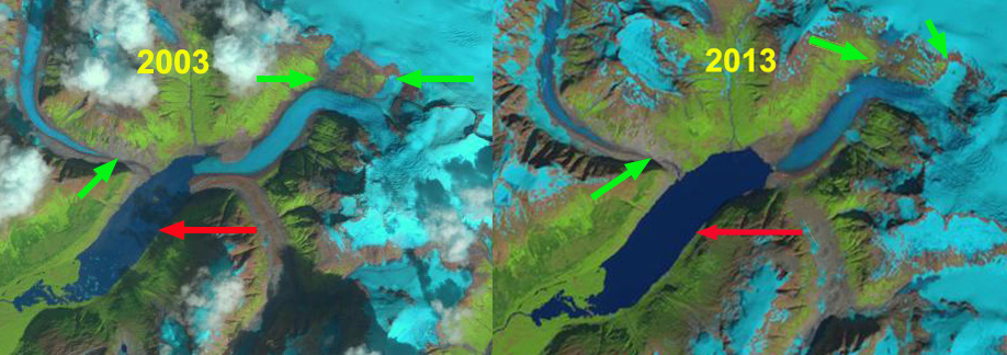 Speel Glacier in 2003 and 2013 Landsat images illustrating lake expansion and detachment of tributaries A-C. Red arrow is 1984 terminus location and green arrows are detachment of tributaries.