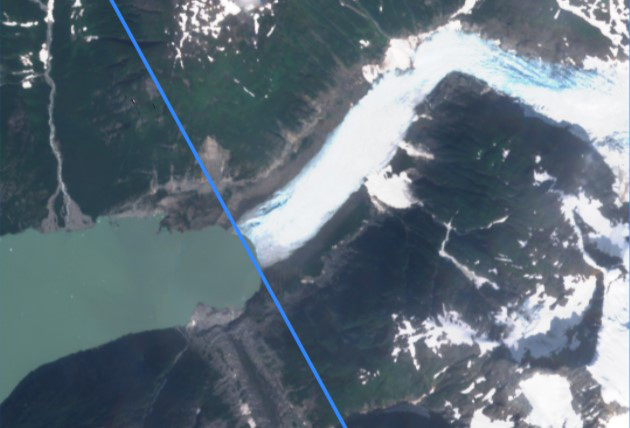 On June 22, 2021 the region between the yellow arrows is an iceberg choked lake. The red arrow indicates the location where Tulsequah Lake used to expand, it is limited. The terminus of the glacier reaching upvalley 600 m from the main glacier. Discharge is at 60,000 cfs and the turbidity is at ~100 FNU. Starting on the June 25th through the 27th turbidity rises to 400 FNU, while discharge rises to 90,000 cfs. This is during a protracted dry period and is the result of the beginning of increased glacier discharge from the lake. On July 27th-June 30th it is evident that the margin of the distributary glacier tongue has receded ~500 m back to the main glacier margin, representing a terminus collapse generating icebergs likely resulting from a fall in water level. There is no change in the small Tulsequah Lake at the red arrow. On July 3rd turbidity rises above 500 FNU and discharge exceeds 130,000 cfs, this is at the high end of the typical peak GLOF events from Lake No Lake as noted by Neal (2007) from 90,000-130,000 cfs. This is the main event and was reported by the USGS. By July 5 Landsat imagery indicates the water level has dropped between the yellow arrows, resulting in more prominent icebergs. The Sentinel image illustrates the zone of iceberg stranding as well. The icebergs continue to melt away by July 20. No change at the red arrow. If we look back to Sept. 2020 we see what Lake No Lake will appear like by the end of summer and that the distributary terminus margin does not extend upvalley at that time. The large proglacial lake that has formed after 1984 due to retreat helps spread out the discharge from ice dammed lake GLOF’s of Tulsequah Glacier. This lake will continue to expand and the damming ability of the glacier will continue to decline, which will eventually lead to less of a GLOF threat from Lake No Lake.