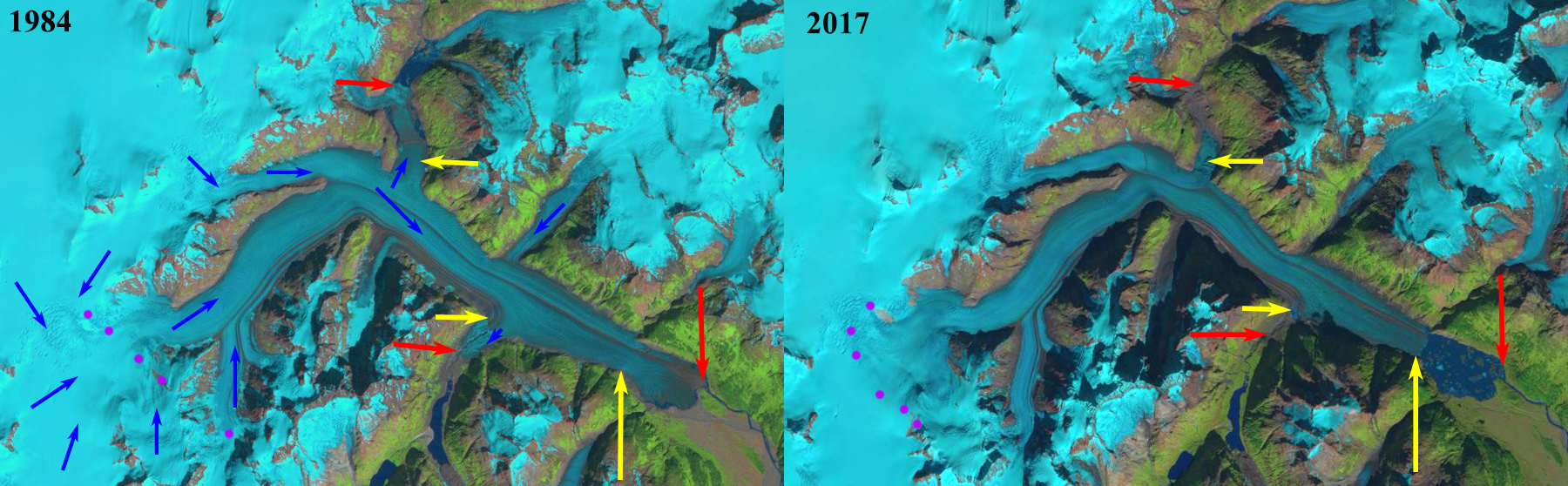 Jacobsen Glacier in Landsat images from 1987 and 2019. Red arrow 1987 terminus location, yellow arrow 2019 terminus location and pink dots the snowline. Point A indciates ice marginal lake in 1987, Point C is the glacier junction, Point B an emerging rock rib and Point D a nunatak.