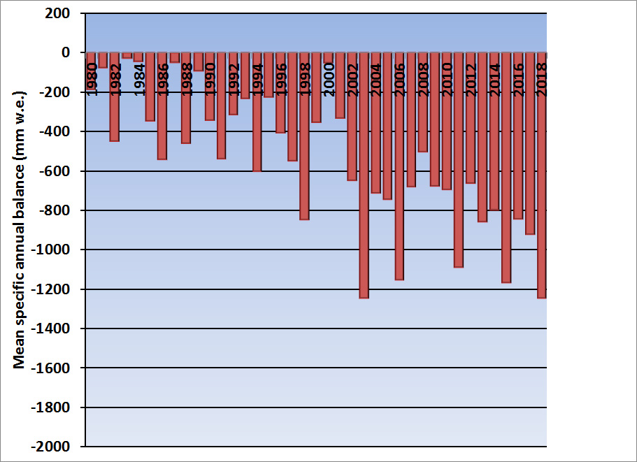 For the last decade I have written the section on Alpine Glaciers for the BAMS State of the Climate report, the 2018 report was published this week, below is the section on alpine glaciers. The key data resources is the World Glacier Monitoring Service (WGMS) record of mass balance and terminus behavior (WGMS, 2017), which provides a global index for alpine glacier behavior. Glacier mass balance is the difference between accumulation and ablation, reported here in mm of water equivalence (mm). Mean annual regionalized glacier mass balance in 2017 was -921 mm for the 42 long term reference glaciers , with an overall mean of -951 mm for all 142 monitored glaciers. Preliminary data reported from reference glaciers to the WGMS in 2018 from Argentina, Austria, China, France, Italy, Kazakhstan, Kyrgyzstan, Nepal, Norway, Russia, Sweden, Switzerland and United States indicate that 2018 will be the 30th consecutive year of significant negative annual balance (.-200mm); with a mean balance of -1247 mm for the 25 reporting reference glaciers, with one glacier reporting a positive mass balance (WGMS, 2018). This rate of mass loss may result in 2018 exceeding 2003 (-1246 mm) as the year of maximum observed loss. as a mean. This WGMS mass balance record has now been regionally averaged before determining the global mean, this has not been done yet for 2018, which will reduce the magnitude of the negative balance.