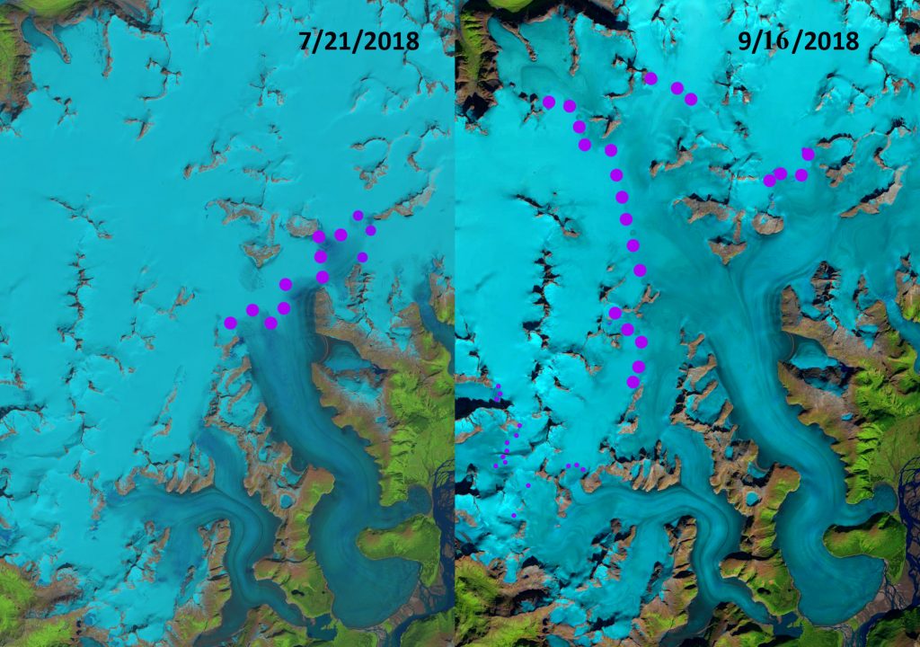 Figure 2. Taku Glacier transient snowline in Landsat 8 images from July 21, 2018 and September 16, 2018. The July 21 snowline is at 975 m and the September 16 snowline is at 1400 m. The average end of summer snowline from is m with the 2018 snowline being the highest observed since observations began in 1946.