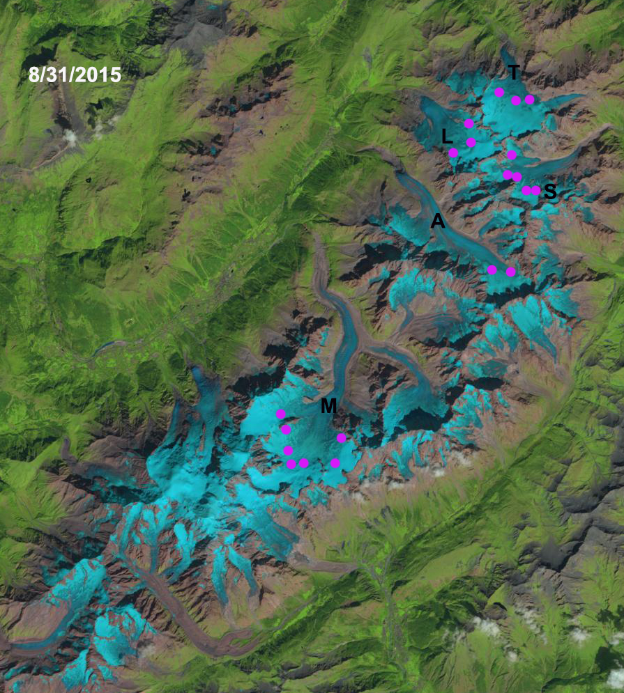 Landsat image of the transient snow line on Mont Blanc Glaciers, France on 8/31/2015. The average snow line (Purple dots) is at 3050 m. Glaciers on Mer de Glace (M), Argentiere (A), Tour Glacier (L), Trient Glacier (T) and Saleina Glacier (S).
