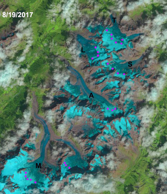 Landsat image of the transient snow line on Mont Blanc Glaciers, France on 8/19/2017. The average snow line (Purple dots) is at 3100 m. Glaciers on Mer de Glace (M), Argentiere (A), Tour Glacier (L), Trient Glacier (T) and Saleina Glacier (S).