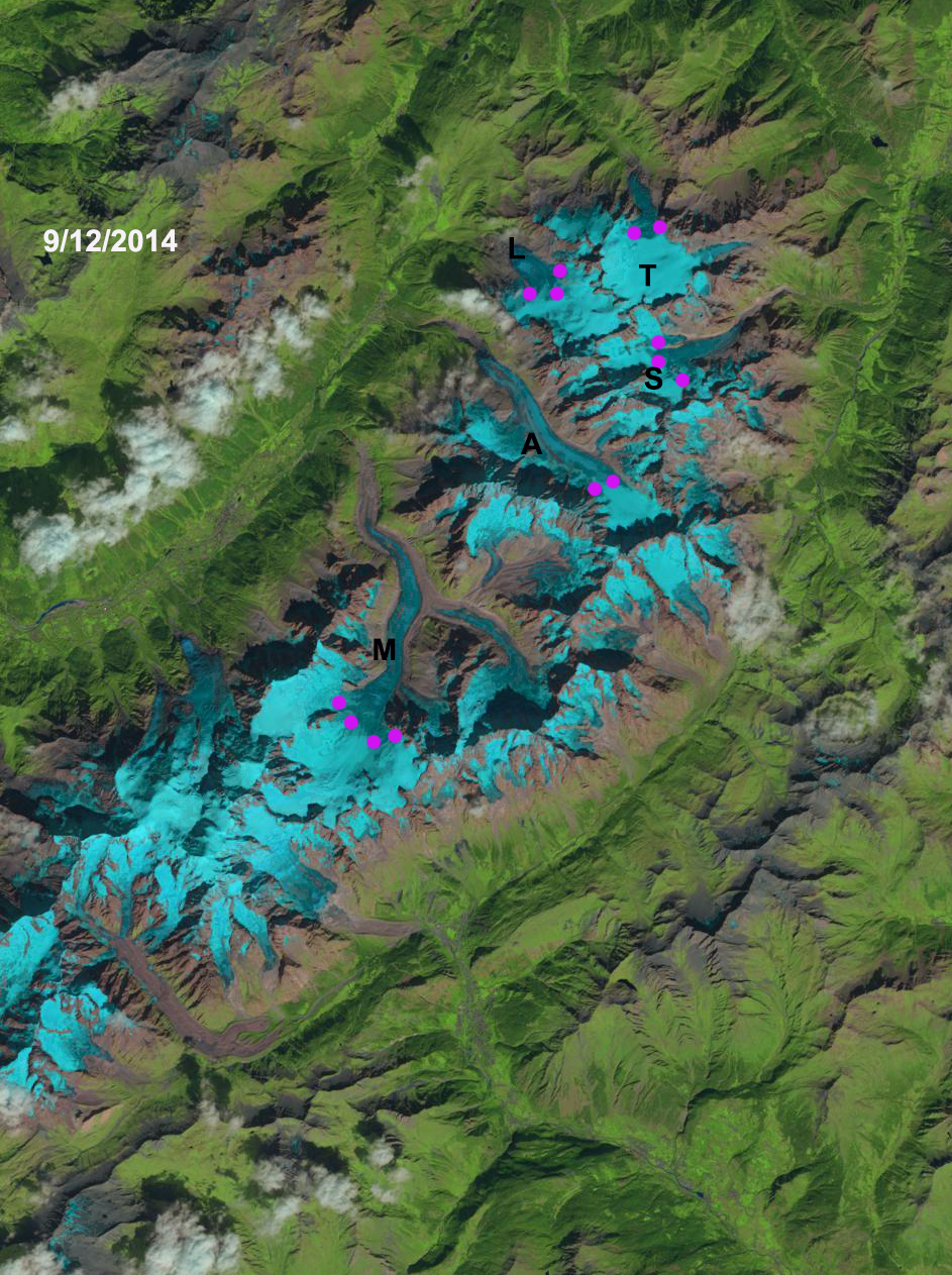 Landsat image of the transient snow line on Mont Blanc Glaciers, France on 9/12/2014. The average snow line (Purple dots) is at 2850 m. Glaciers on Mer de Glace (M), Argentiere (A), Tour Glacier (L), Trient Glacier (T) and Saleina Glacier (S).