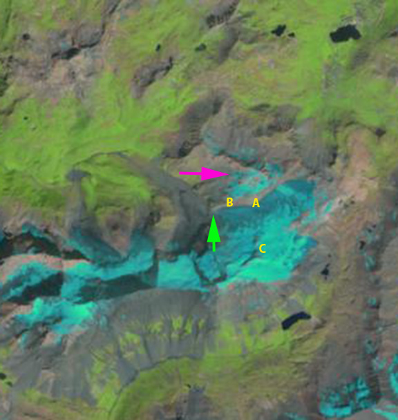 Landsat image of the transient snow line on Mont Blanc Glaciers, France on 8/11/1985. The average snow line (Purple dots) is at 2800 m. Glaciers on Mer de Glace (M), Argentiere (A), Tour Glacier (L), Trient Glacier (T) and Saleina Glacier (S).