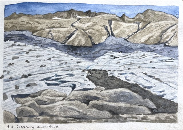 How does being present in a place shape our understanding? To the left is a view of Sholes Glacier, complete with my on-site rendition. I can’t express how lucky I feel to have had the chance to experience these places first hand. To interact with a place by attempting to capture its likeness — paying attention to the negative space not only between the white snowpack and black exposed rock, but in the empty, carved-out area that used to be filled with ice. Experiencing the texture of the glacier under your feet, the cool air drifting off the snow, the good tired feeling of your body after physically traversing top to bottom. This is what you don’t get from a photo. To know places such as these is to love them and see their role in the world, and want to protect them. But so many never get the chance to understand them this way.-Claire Seaman