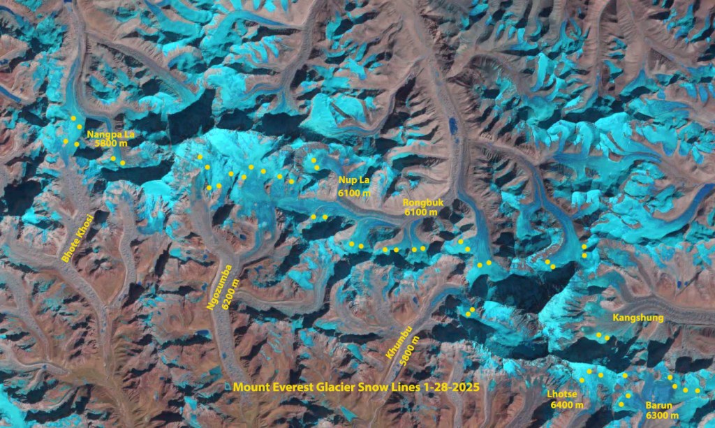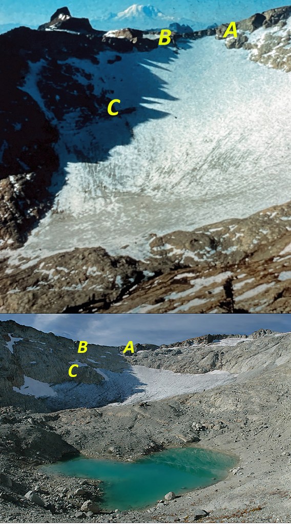 The trajectory for most North Cascade glaciers is one of fragmentation. This is illustrated by Foss Glacier on the east flank of Mount Hinman, that we began observing annually in 1984 but stopped measuring as it fragmented. Foss Glacier from the top was a 1 km long and nearly 600 m wide glacier. In Sept. 2025 Cal Waichler captured view from the top with the two main fragments now less than 50 m wide and 300 m long.-Mauri Pelto