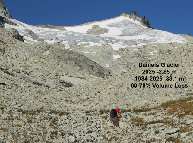 We hiked into North Cascade glacier to complete detailed observations for our 42nd consecutive year. These annual observations provide a detailed assessment of their response to climate change. For the third consecutive year North Cascade glacier on on average lost more than 2 m of glacier thickness. This cumulative loss of 7-8 m on most of the ranges glaciers that average 25-40 m in thickness represents 20% of their volume lost in just three years. On a few of the largest glaciers, such as those on Mount Baker that average 40-60 m in thickness the loss represents 12% of their volume lost.