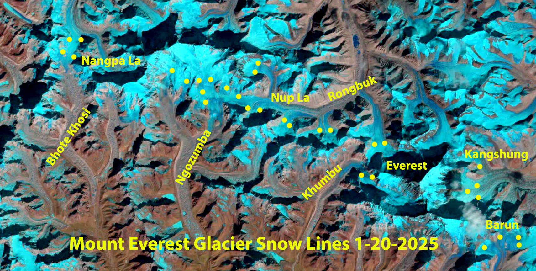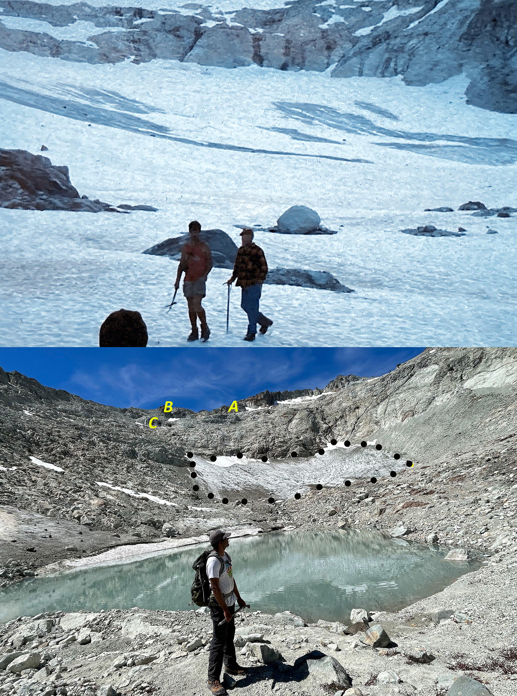 The trajectory for most North Cascade glaciers is one of fragmentation. This is illustrated by Foss Glacier on the east flank of Mount Hinman, that we began observing annually in 1984 but stopped measuring as it fragmented. Foss Glacier from the top was a 1 km long and nearly 600 m wide glacier. In Sept. 2025 Cal Waichler captured view from the top with the two main fragments now less than 50 m wide and 300 m long.-Mauri Pelto