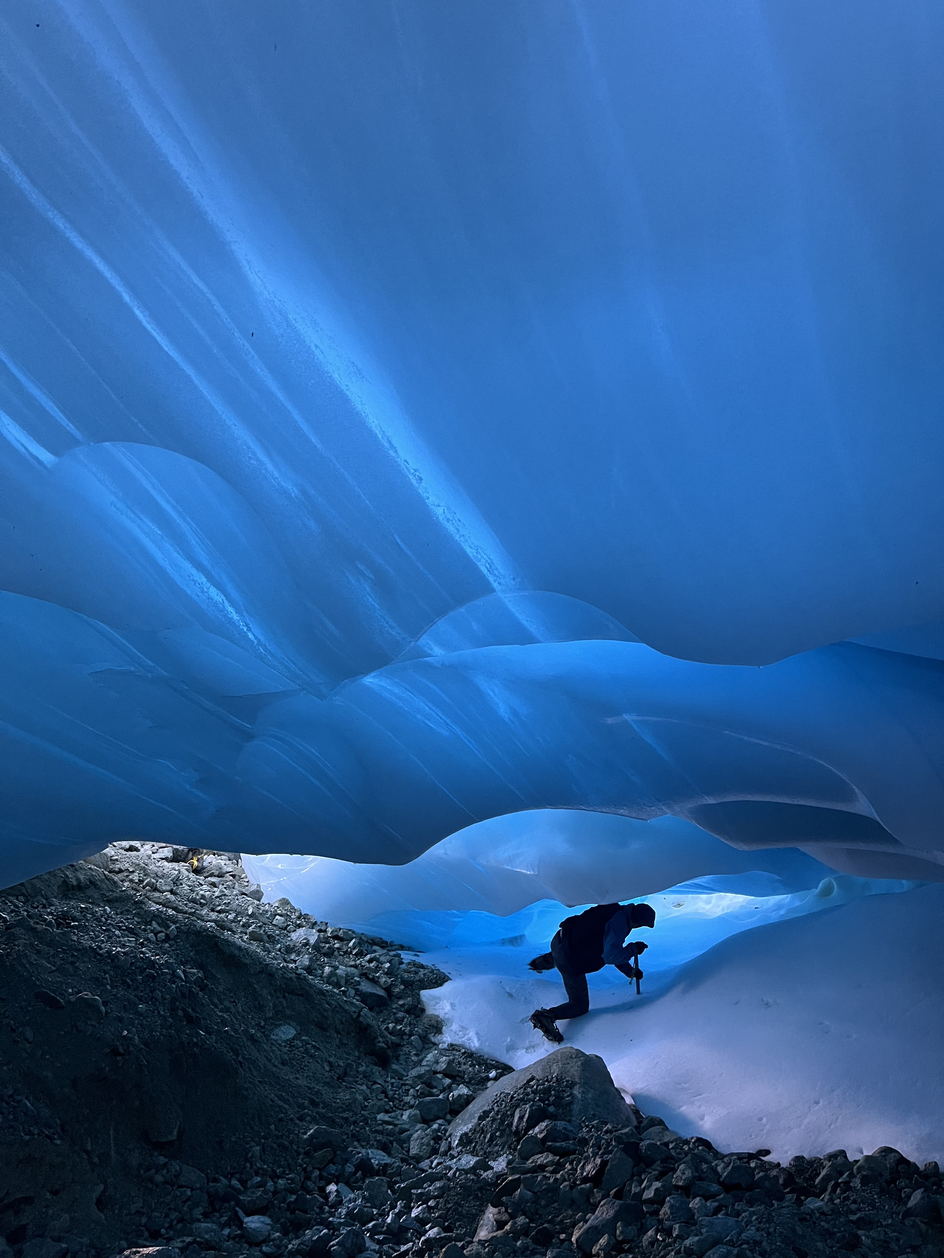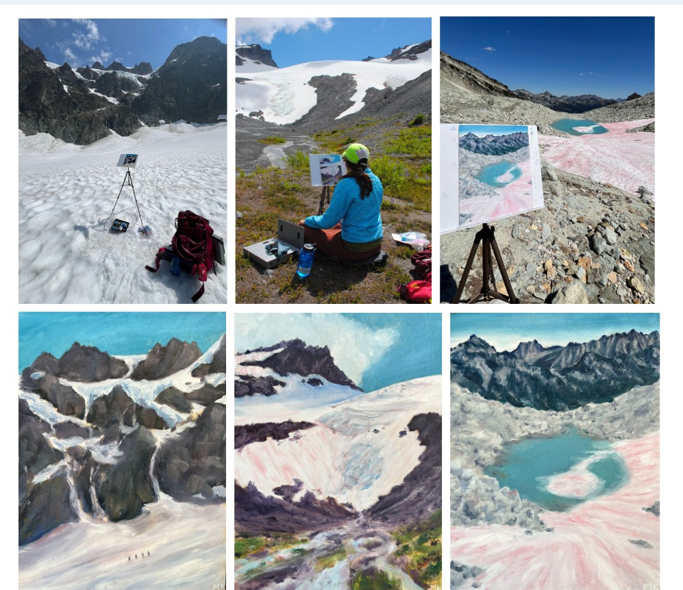 As a backcountry skier and oil painter focused on winter landscapes of the North Cascades, the idea of painting glaciers in the field was a dream come true! I knew what we would see and learn about the health of our glaciers from the scientists would be highly emotional, but the power of these environments disappearing in our lifetimes is something my words fail to communicate how devastating that feels. During the study on Rainbow glacier I caught on film the moment a serac collapsed, loudly crashing, crumbling from a newly melted out rock knob down the mountain splitting into smaller and smaller pieces. It looked sickly as it broke before our eyes. Another unique experience was going into a teal, translucent, otherworldly ice cave. I have started 2 paintings to capture this vanishing environment. My goal is to assist the project in translating the study’s findings through landscape paintings that communicate the beauty of these places with titles that call attention to the retreating glaciers in the North Cascades. We all have a responsibility as humans to make individual changes to combat climate change and vote like fresh water and air depends on it, because it does. -Margaret Kingston