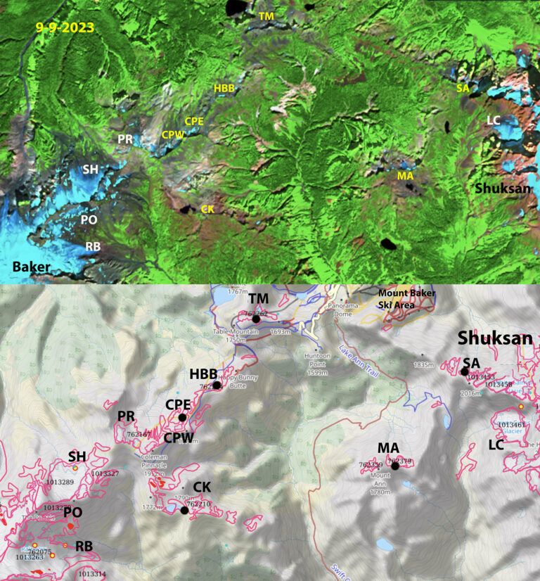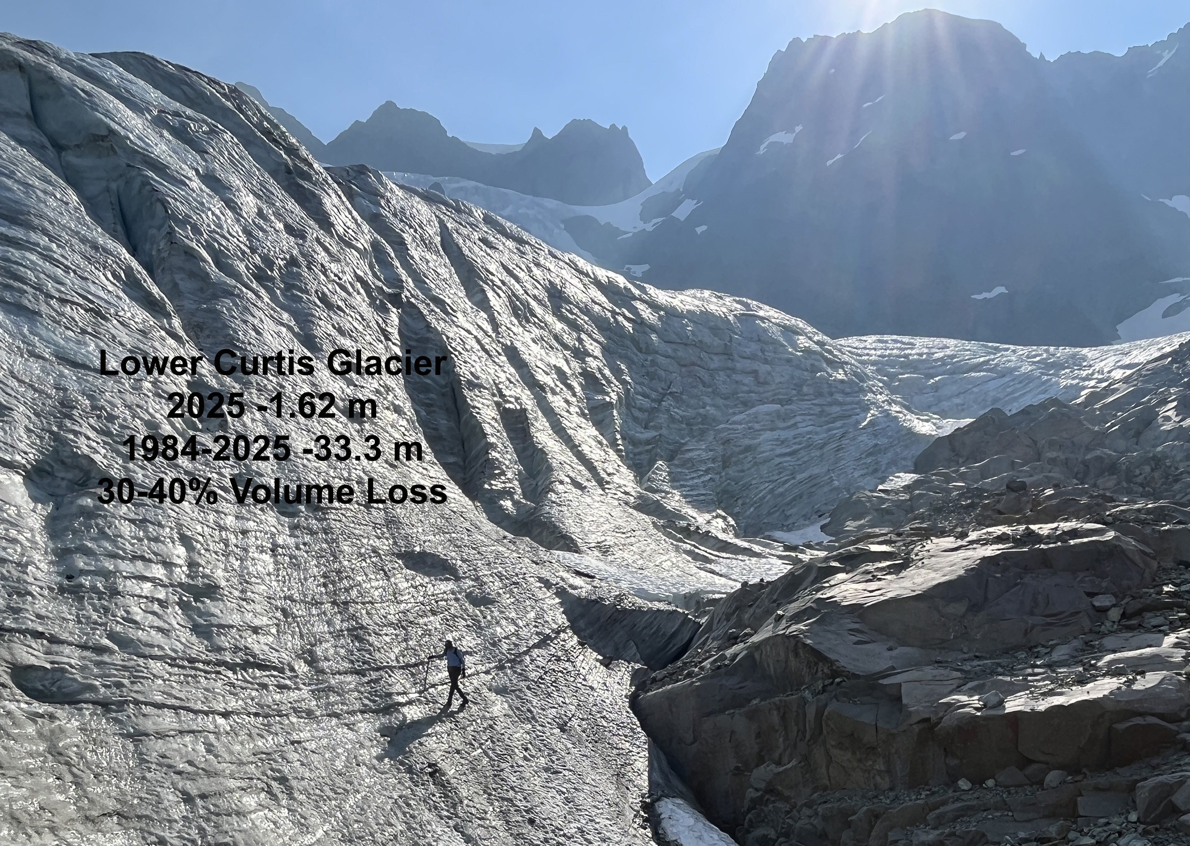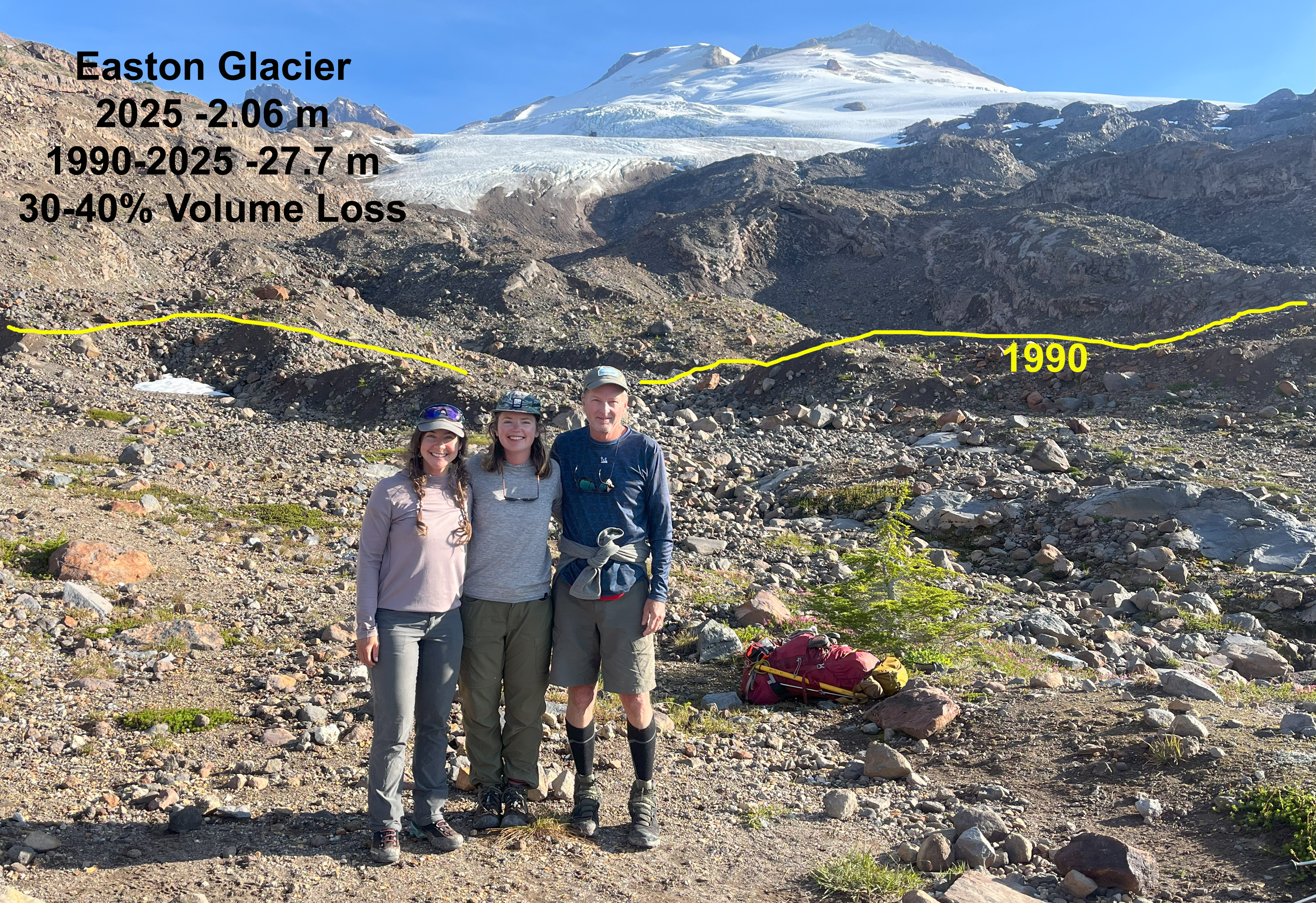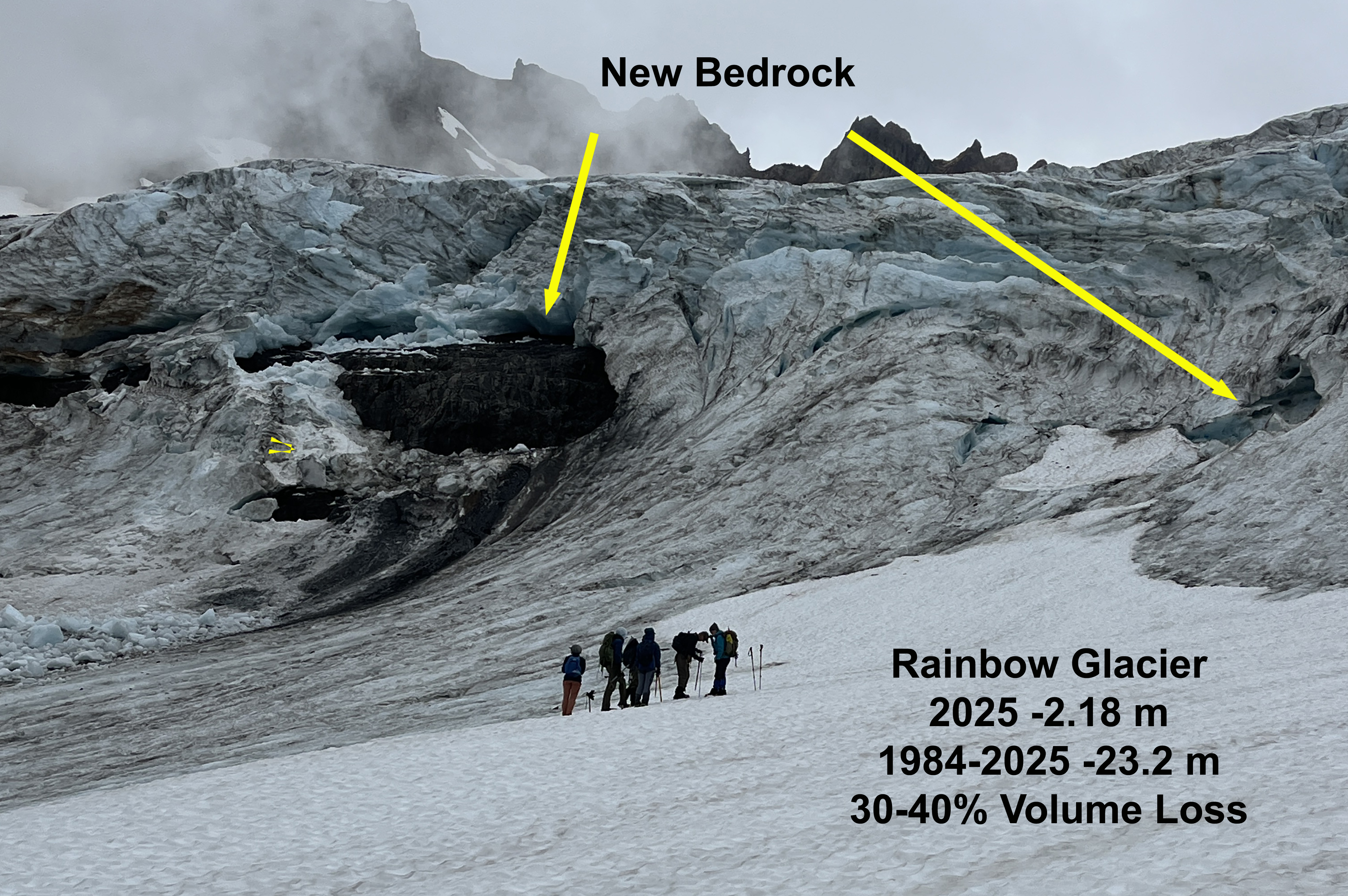 We hiked into North Cascade glacier to complete detailed observations for our 42nd consecutive year. These annual observations provide a detailed assessment of their response to climate change. For the third consecutive year North Cascade glacier on on average lost more than 2 m of glacier thickness. This cumulative loss of 7-8 m on most of the ranges glaciers that average 25-40 m in thickness represents 20% of their volume lost in just three years. On a few of the largest glaciers, such as those on Mount Baker that average 40-60 m in thickness the loss represents 12% of their volume lost.