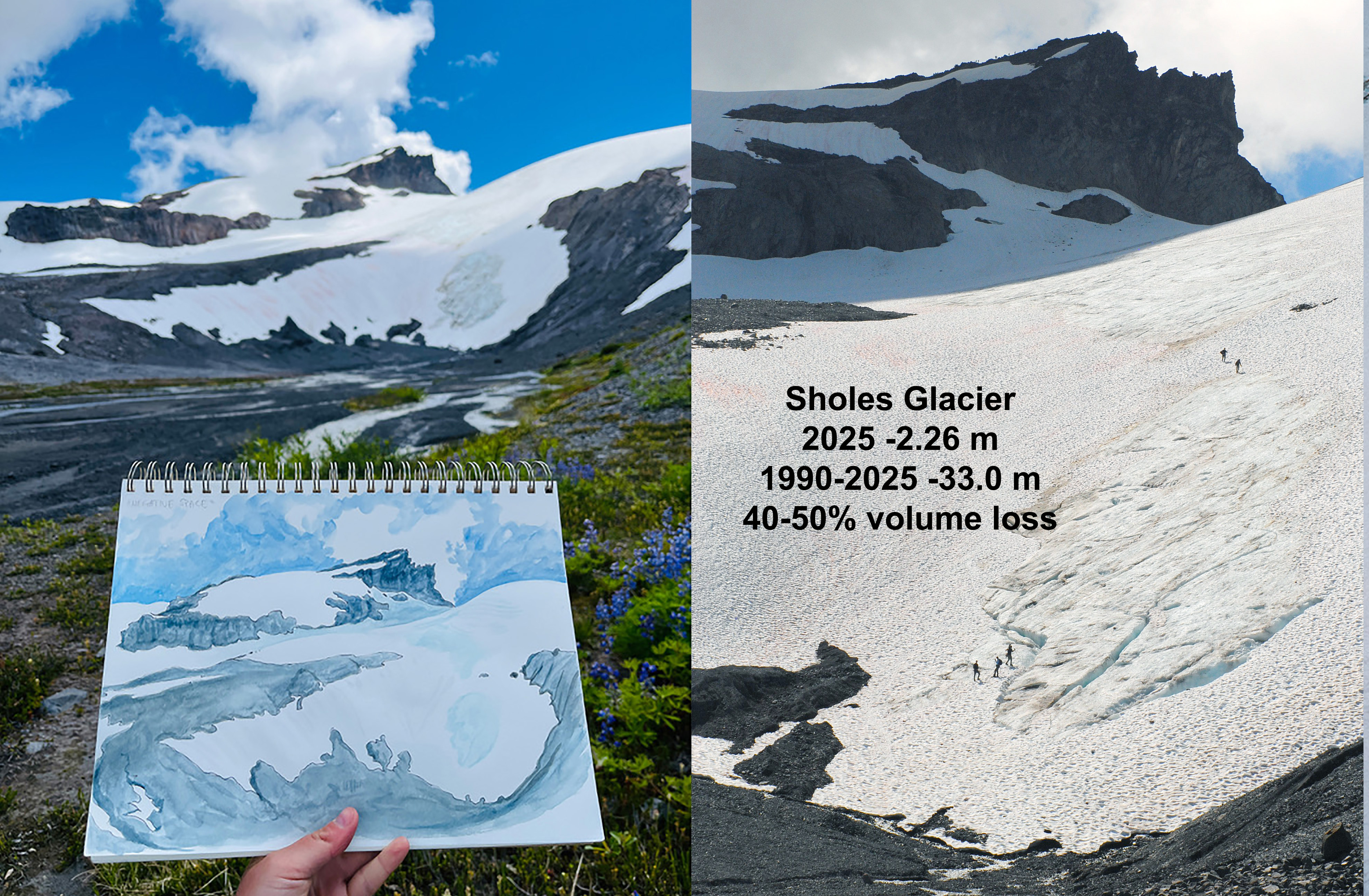 I write this at the end of the 2025 hydrological year, waiting for winter snow to shelter the land I love in a cool white blanket. The devastation of the alpine glaciers has surfaced so frequently in conversation these last couple months. Those who have seen the mountains are alarmed as beds of ice they once knew to be hundreds of feet thick look shallow and frail, ice pitches that were once climbed are now grey gullies of rock, and volcanoes which have always been white are unnervingly gray and shrouded in smoke. The realities of climate change in the Northwest are clear.
