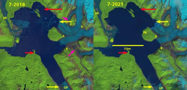 Pederse Glacier retreat in Landsat images, leading to rapid lake expasion to 4 km2.