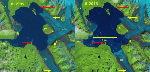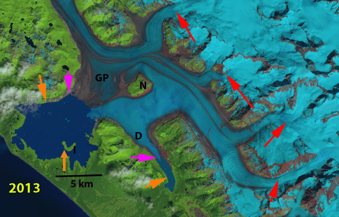 Grand Plateau Glacier in 1984 Landsat image indicating 1984 terminus at orange arrows, 2013