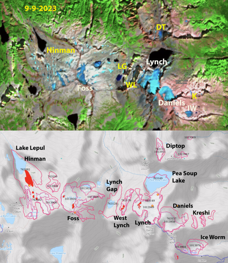 In 1984 there were nine glaciers spread across the Mount Daniel-Mount Hinman complex. You could traverse from one to the next with limited time off snow and ice. By late summer of 2023 only three glaicers remained. We monitored Daniel, Ice Worm and Lynch every years since 1984. Ice Worm no longer a glacier in 2023.