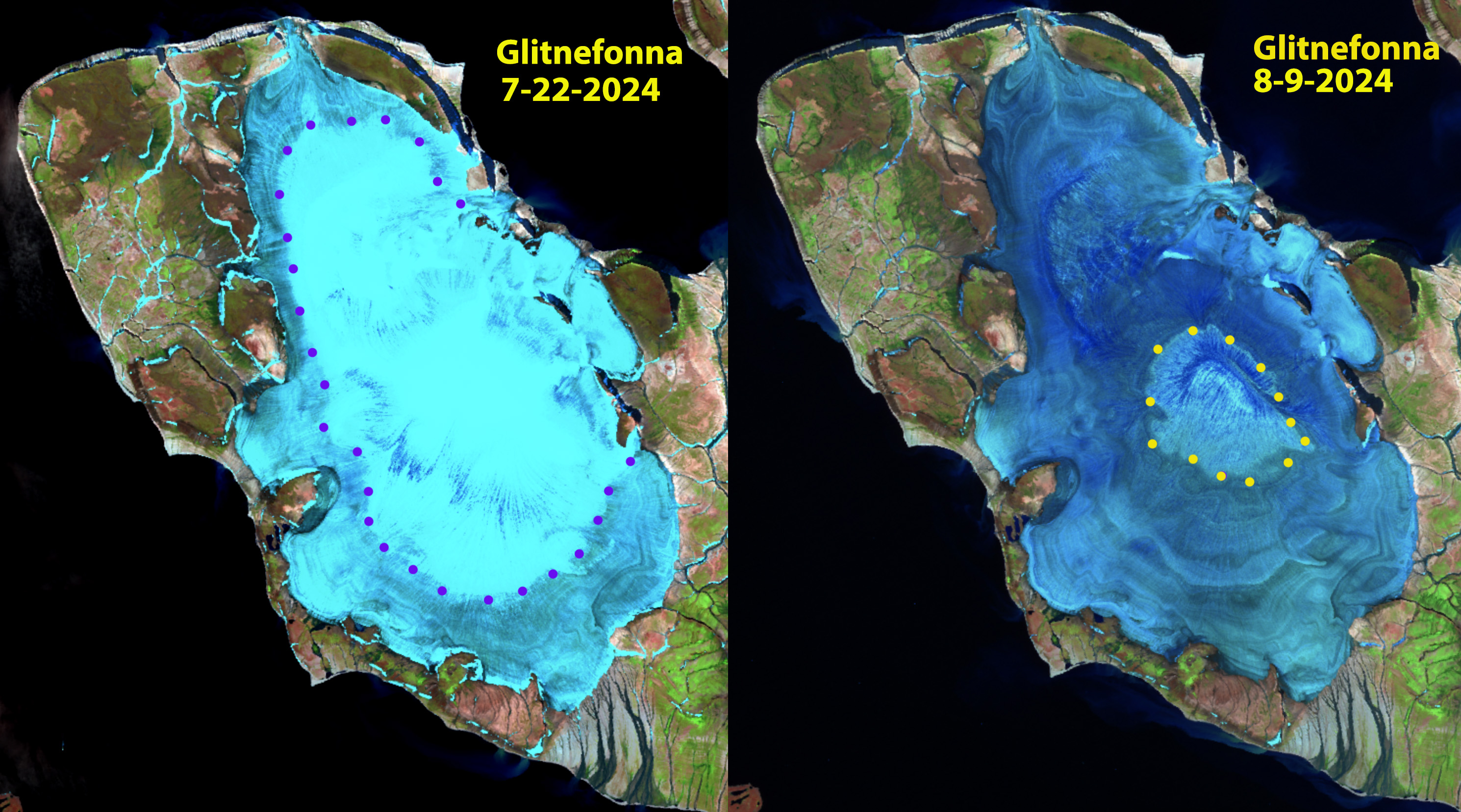 Glitnefonna is a 145 km2 ice cap in Gustav Albert Land where snowcover declined from 55% snowcover on 7-22 (purple dots) to 0% snowcover on 8-9-2024 in these Sentinel images. A small area of saturated firn/snow is evident, yellow dots.Glitnefonna is a 145 km2 ice cap in Gustav Albert Land where snowcover declined from 50% snowcover on 7-18 (yewllow dots) to 0% snowcover on 8-9-2024 in these Landsat images.