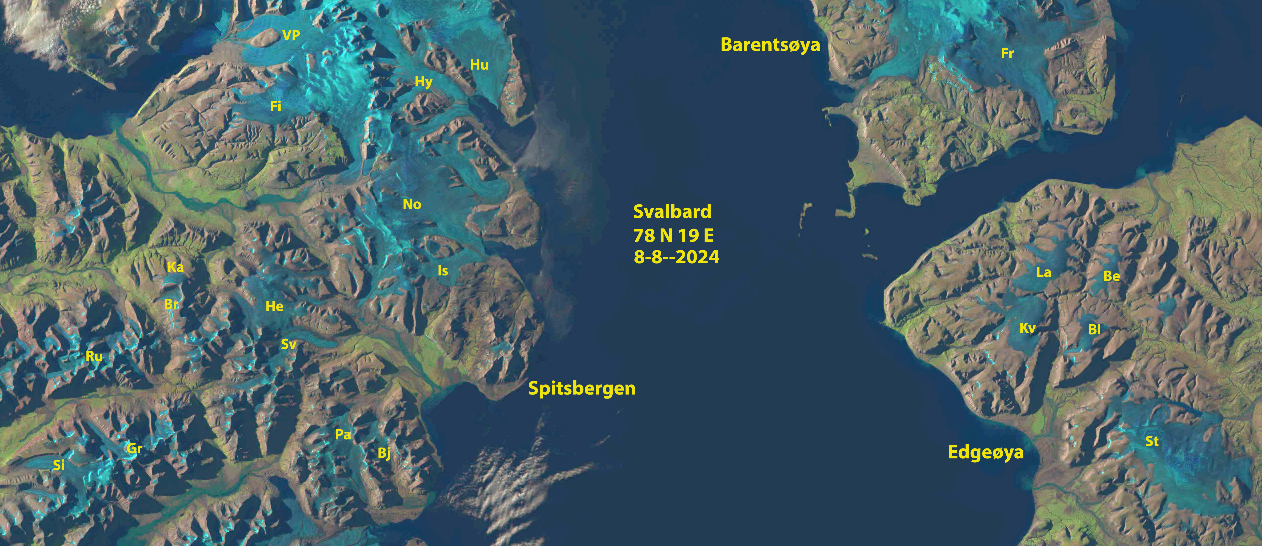 Most Svalbard glaciers in this Landsat image from 8-8-2024 are snow free. This view is centered on 78 N and 19 E spanning parts of Barentsoya, Edgeøya and Spitsbergen. On Langjokulen (La), Kvitisen (Kv), Bergfonna (Be), Blaisen (Bl) and Storskavlen (St) on Edgeøya snow cover is gone. Bjarmanbreen (Bj), Passfonna (Pa), Hellefonna (He), Sveigbreen (Sv), Nordmannsfonna (No), Isrosa (Is), Kamfonna (Ka), Breitfonna (Br), Rugaasfonna (Ru), Hayesbreen (Hy), Heuglinbreen (Hu) on Spitsbergen all snowcover is lost.There is a small amount of snowcover left in the upper reaches of a few glaciers including Freemanbreen (Fr), Gruvfonna (Gr), Siakbreen (Si), Von Postybreen (VP) and Fimbulisen (Fi).