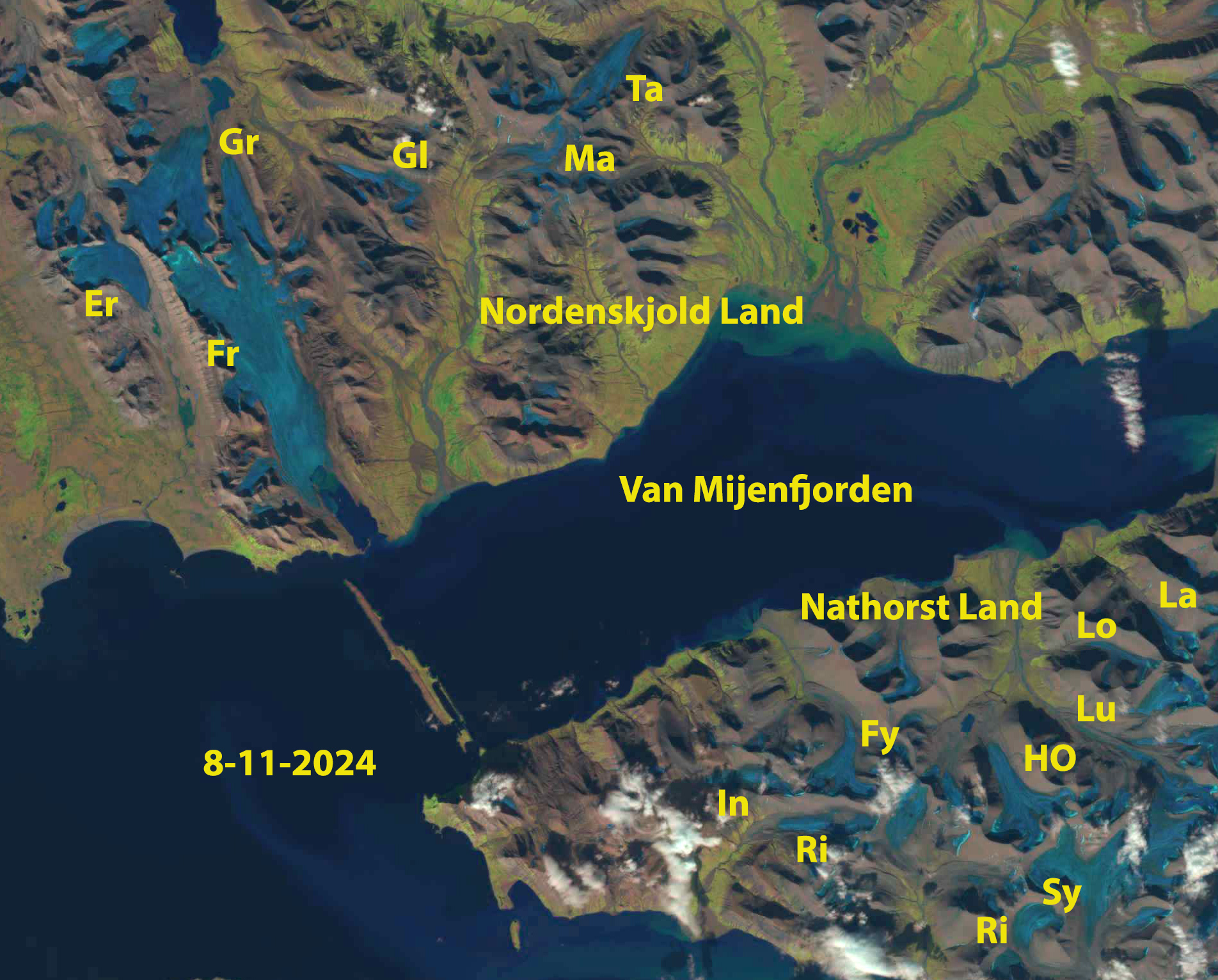 All the glaciers labelled in the Nathorst Land and Nordenskjold Land region of Svalbard are snow free on 8-11-2024 in this Landsat image. Er=Erdmannbreen, Fr=Fridtjovbreen, Gr=Gronfjorden, Ta=Taviebreen, Ma=Marstranderbreen, Gl=Gleditschfonna in Nordenskjold. HO=Hoegh Omdalbreen, Sn=Snokubreen, Fy=Frysjabreen, In=Instebreen, Ri=Richterbreen, Ri=Ringerbreen, La=Langlibreen, Lo=Loyndebreen, Lu=Lundbreen, Sy=Sysselmannbreen in Nathorst Land.