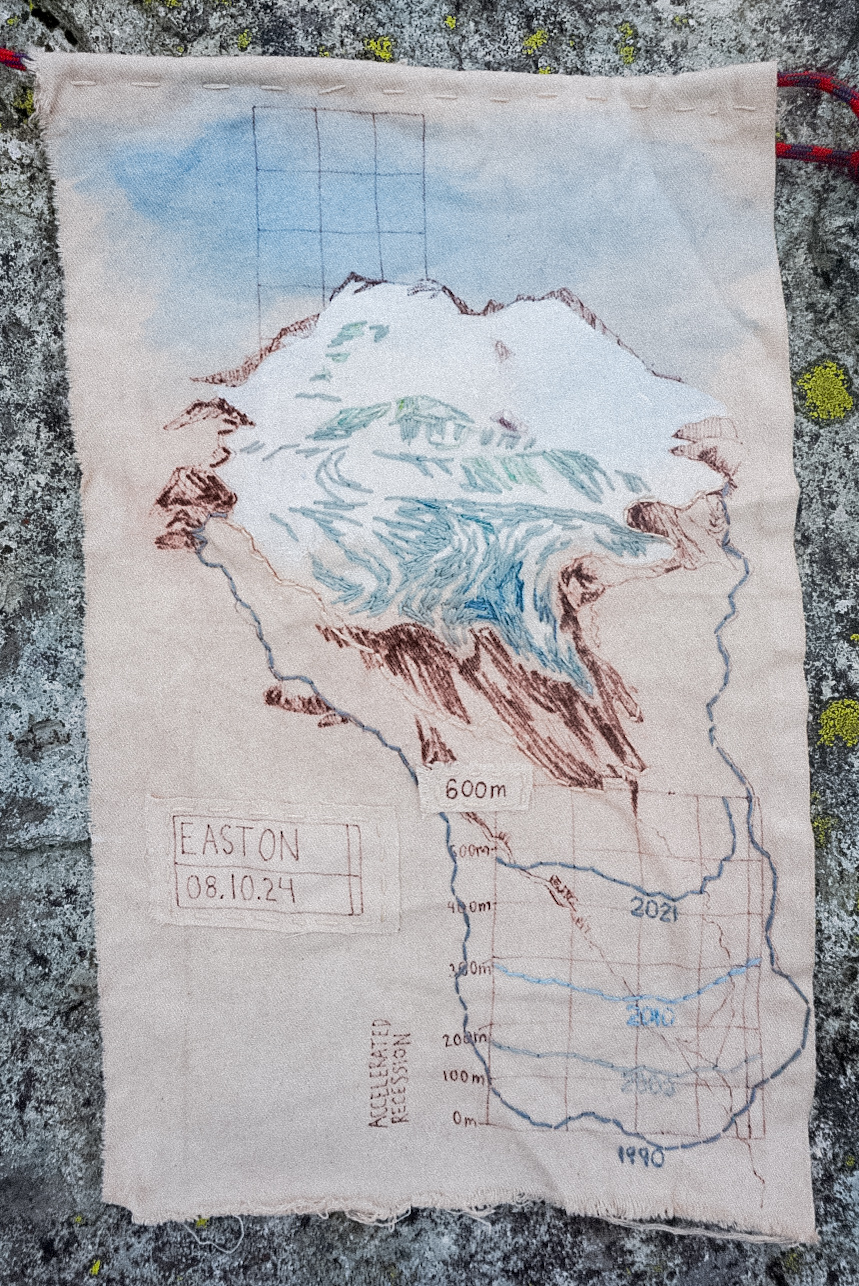 Emma Murray: Just a few minutes into our hike from camp to the Easton glacier, Science Director Mauri Pelto pointed out the rock that marked the spot where he put his crampons on in 1990. Looking up the valley, the ice felt SO far away. This glacier has retreated almost 600m in my lifetime already. In response to the melting at each of the six glaciers I visited during my time with the Project, I added paint, pen, and thread to canvas. These flags are both white-flag surrenders to all the melting we cannot stop and blowing-in-the-wind prayers for us all to act in the ways we can. I hope these pieces help people to visualize and feel the difference between where the ice was and where it is now. I think feeling that loss is groundwork for our urgent conversations about climate solutions, which can be uplifting and cool and pragmatic and creative!