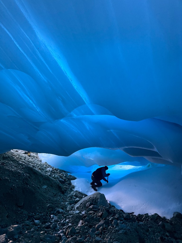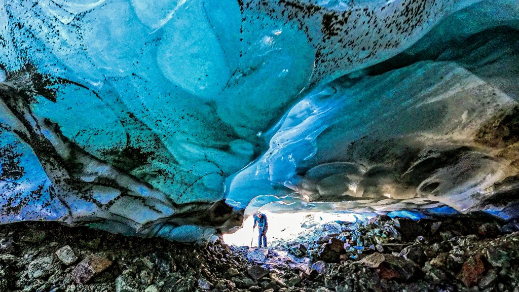 Mauri Pelto: Climate change has led to increased glacier melting on all of the glaciers we have observed. A combined 70+ years of field experience that Ben, Jill and I have provides a context that is crucial. The increased melt is apparent in the streams flowing across the surface very few meters carrying meltwater to the rivers and then the sea. This summer we saw the beauty of the final stages of decay of a glacier melting away in the ice caves that transected the former Ice Worm Glacier (image below). The cave started at the top of the glacier and continued right to the bottom, by next summer that too will be gone. The colors and atmosphere in the cave were spell binding. The landscape remains beautiful, but is losing the glaciers that are a powerful, beautiful and dynamic part of this landscape.