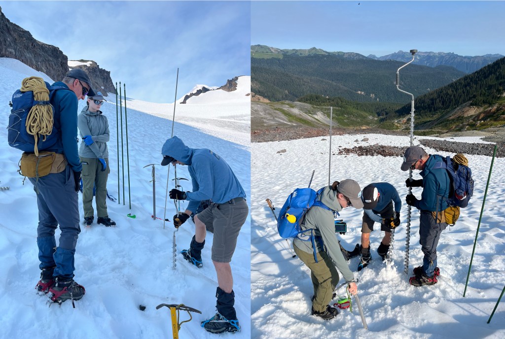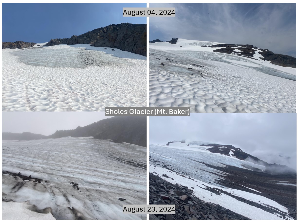 This field season follows the 2021, 2022 and 2023 seasons that featured either historic heat waves and periods of extended warm weather. The heat led to a greater exposure of bare ice on glaciers with a higher albedo and greater density. The observed melt rates are 7-9 cm/day water equivalent during warm weather events vs 4-6 cm/day for snow surfaces. This led to substantial mass losses (glacier thinning) on North Cascade glacier for the three years of ~5 m. In 2024 winter snowpack in the North Cascades above 1200 m in 2024 was 60-75% of normal on May 1. May and June featured more new snow on the glaciers, mixed with periods of warm weather helped slow the loss of the limited snowpack above 1500 m.