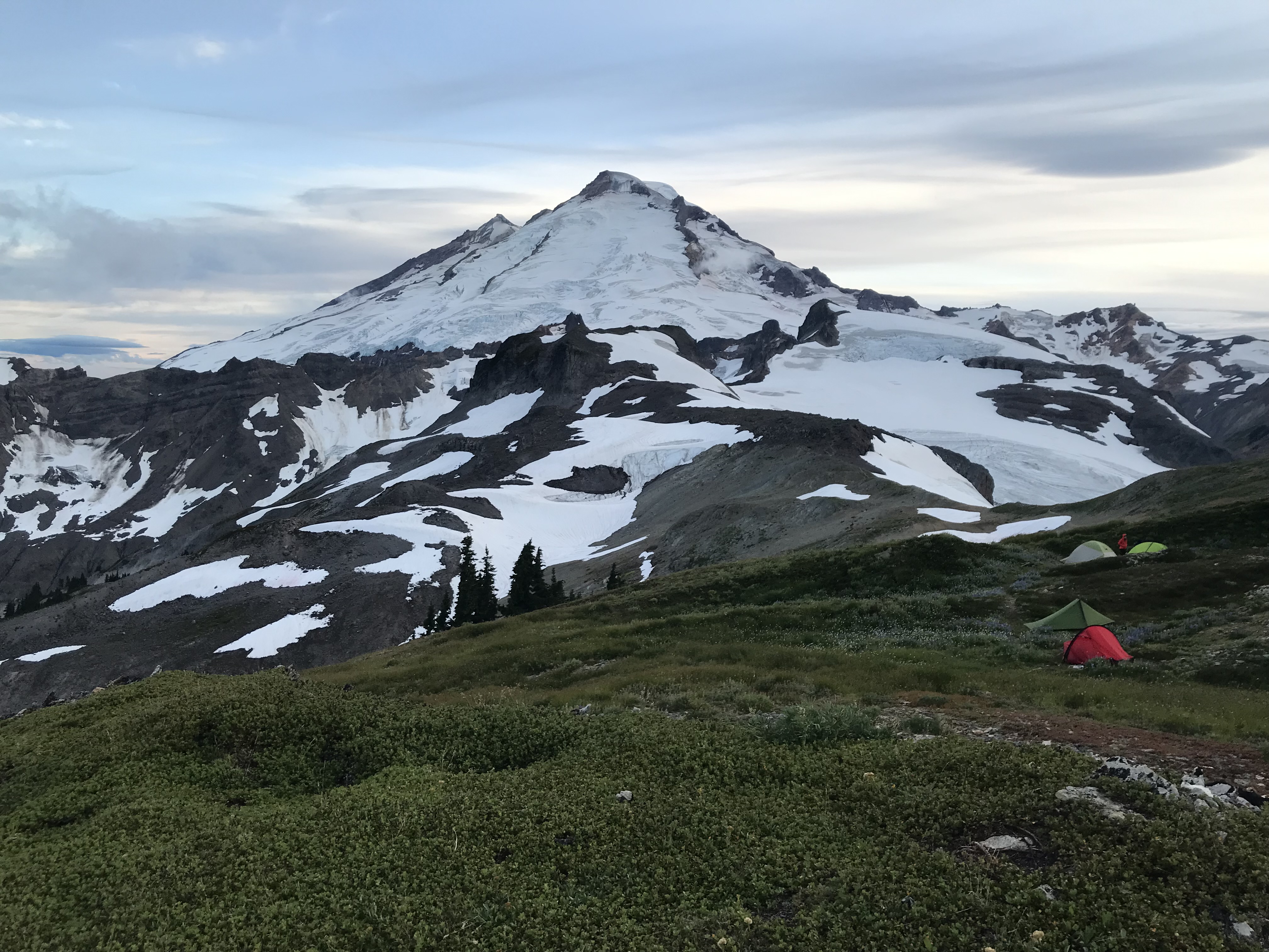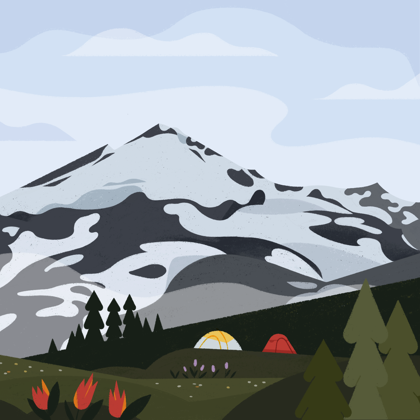 Megan Pelto: To me, Mt. Baker represents the North Cascades. Camping next to its looming presence makes me aware of how impactful it is, its glaciers helping support the ecosystem and the wildlife that surround it. Getting to be present in this wilderness feels like a gift and a chance to both disconnect and reconnect. Everything you have is contained in one little tent and the experience of camping in this landscape is magical. I wanted to capture that with our colorful little tents tucked into grassy hills with Baker above us. I have been able to visit this landscape over the past 10 years, and while the glaciers change each year, many things have remained peacefully the same.