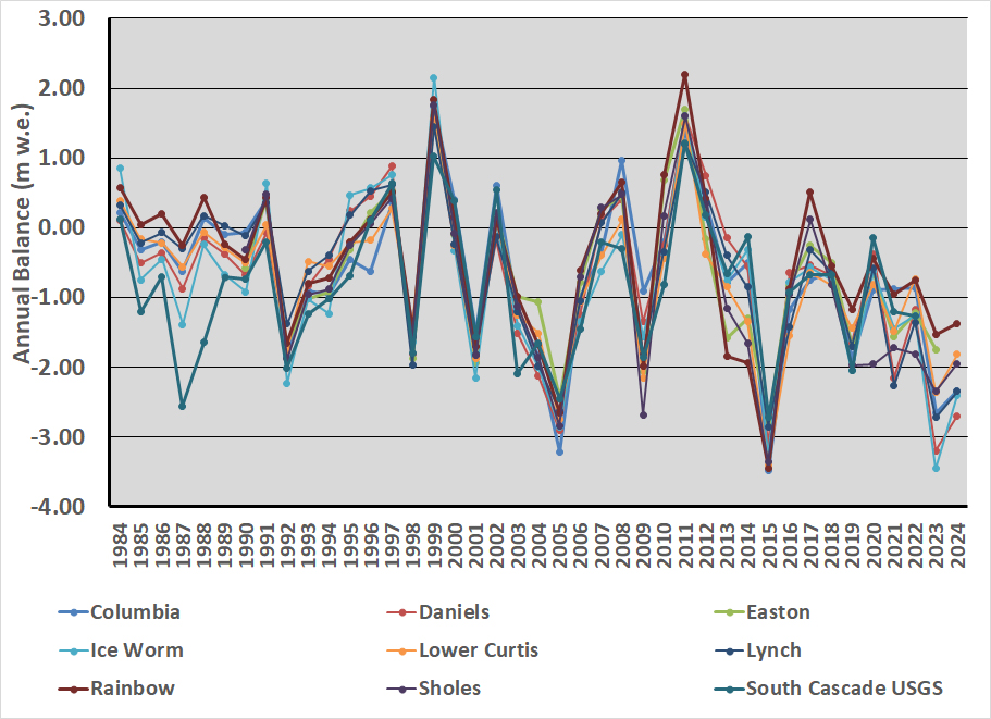 Annual mass balance time series for the eight glaciers we monitor and the USGS monitored South Cascade Glacier. In 2024 Columbia=-2.34, Daniels=-2.70, Easton=-1.74, Ice Worm=-2.40, Lower Curtis=-1.82, Lynch=-2.35, Rainbow=-1.38, Sholes=-2.35.