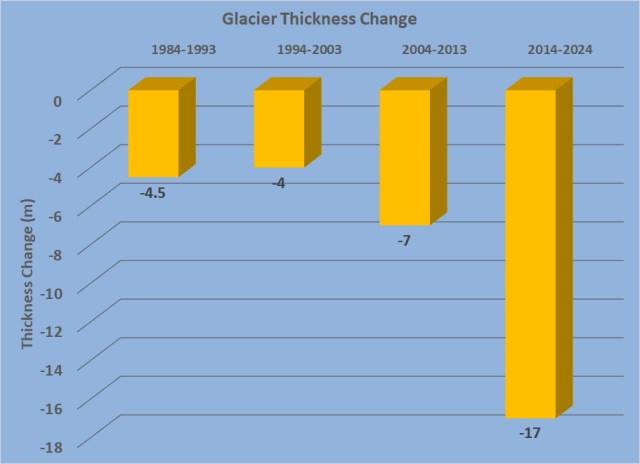 All eight glaciers had a negative balance exceeding 1.3 m w.e., with an average of -2.09 m w.e., this is equivalent to at ~2.25 m of glacier thinning. The loss during the last four years is unprecedented with 8 m of average thickness lost from 2021-2024. This is greater than the entire decade of loss for 184-1993, 1994-2003 or 2004-2013. The acceleration of loss continues even as the glaciers lose their highest melting terminus regions. This is an indication that none of the glaciers are approaching equilibrium. The cumulative mean mass balance loss has been -28.89 m w.e., ~33 m in thickness. This represents the loss of ~40% of volume of the glaciers we have observed, 1% loss per year overall but over 2% per year in the last decade.