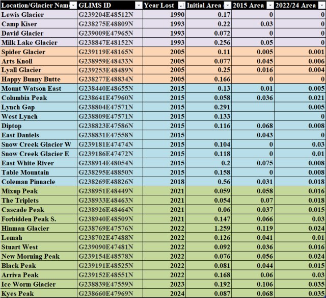 There are 31 active glaciers across the North Cascades that we observed since the 1980s that have now disappeared. The list below indicates the year they were lost, the area of the glaciers in the GLIMS inventory for initial area (1958-1984), 2015 area, and the area of the former glacier in 2022/24. This is not a complete list of glaciers lost in the North Cascade Range. The rate of loss is clearly accelerating.