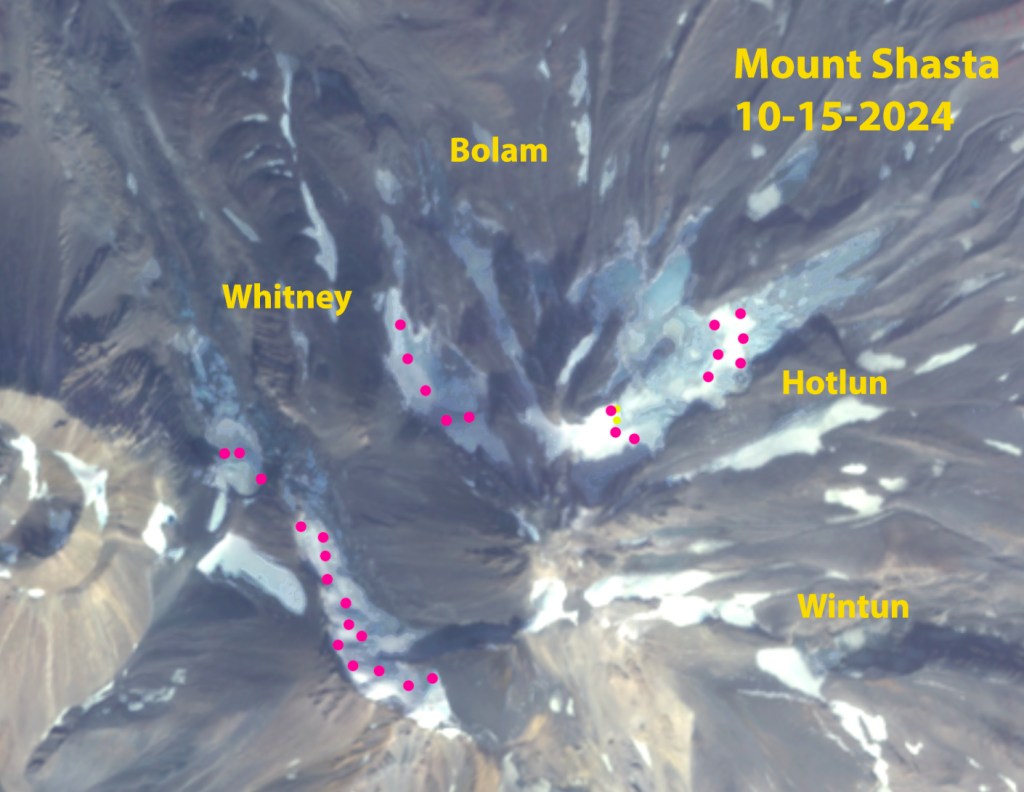 Snow cover extent on Mount Shasta glacier as the melt season ends in 2024. Oct. 15, 2024 Sentinel image, red dots indicate outline of snowcover areas ~25% of glacier area.