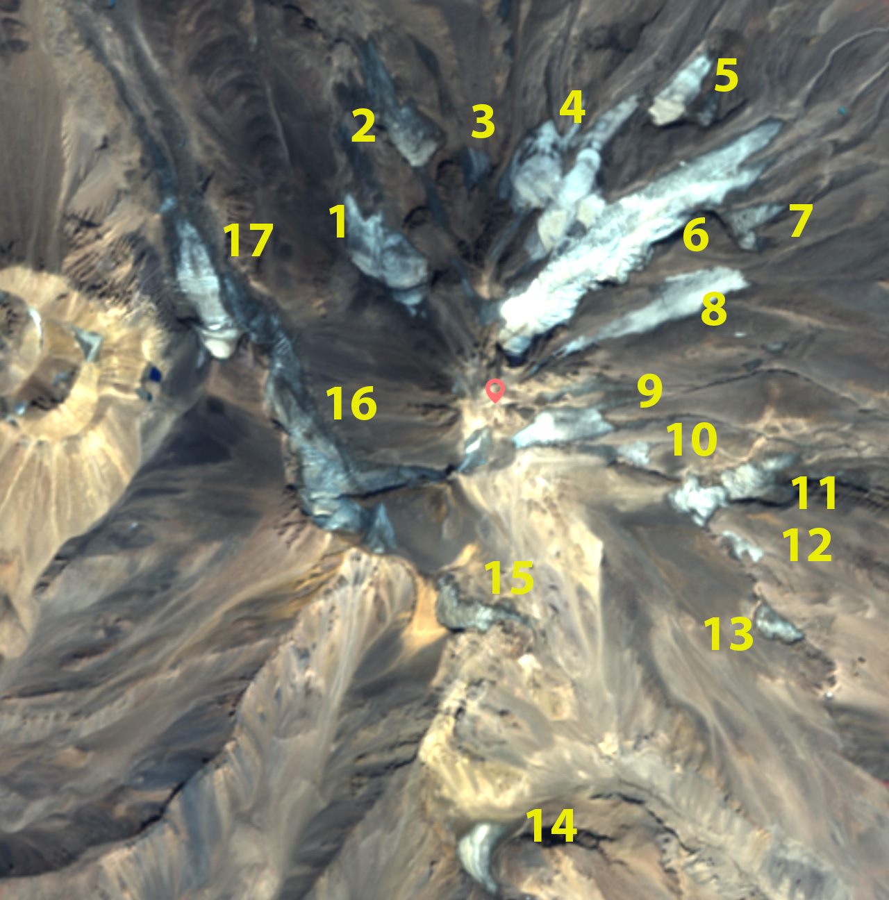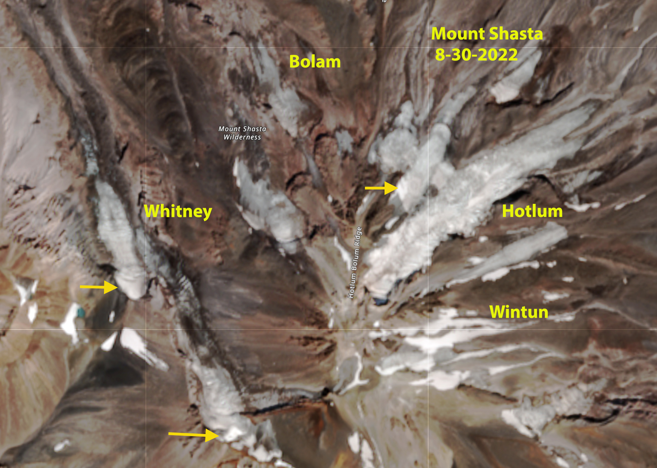 Snowcover extent on Aug. 30, 2022 on Munt Shasta Glaciers. Yellow arrows indicate that less than 10% of the glaciers are snowcovered.