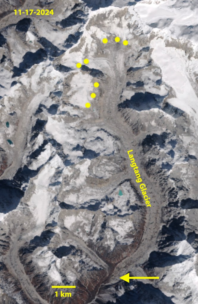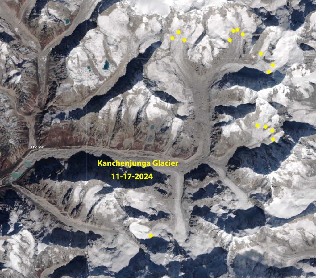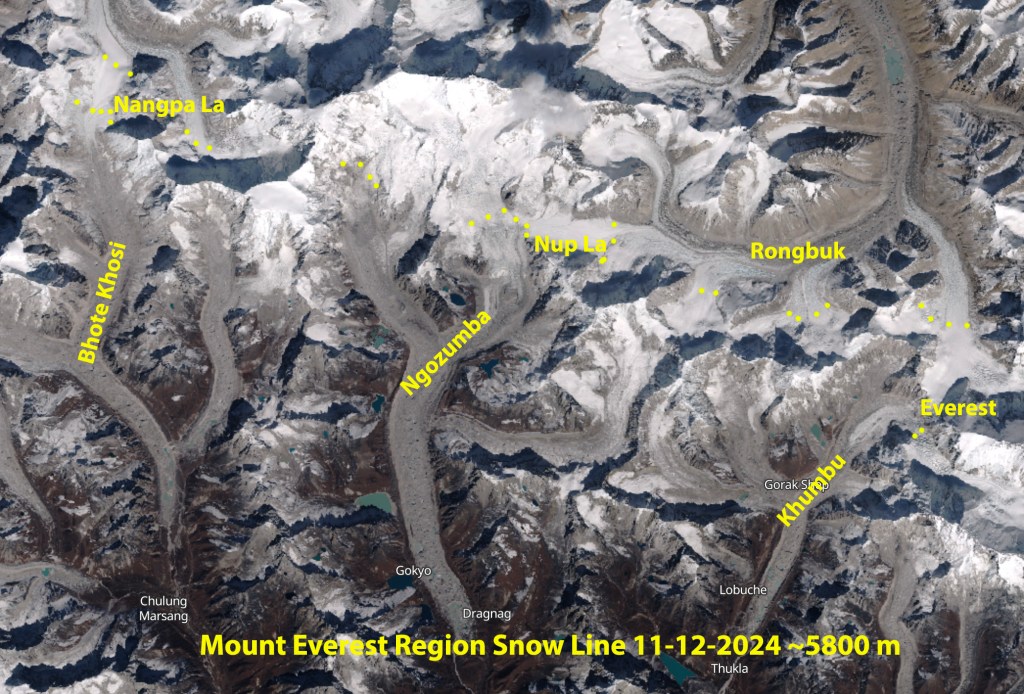 The snow line on Mount Everest Region glaciers on Feb. 11, 2024 indicated by yellow dots on the Landsat image. Note that Nangpa La and Nup La-two high passes (5800-5900 m) are both snow free. The average snow line is 6000 m.