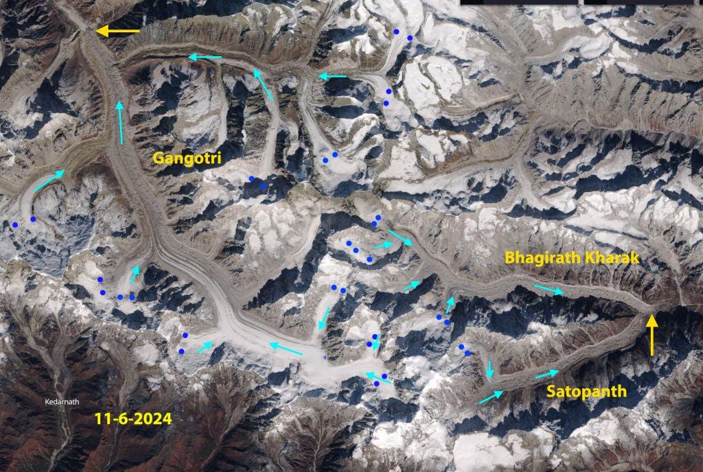 Kanchenjunga Glacier with the November 17, 2024 snow line averaging 6000 m.Langtang Glacier, Nepal with the snow line on November, 17 2024 averaging 5500 m.Gangotri, Satopanth and Bhagirath Kharak Glacier snow line on Sentinel 2 image from 11-06-2024. Mean elevation is 5500 m.