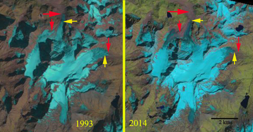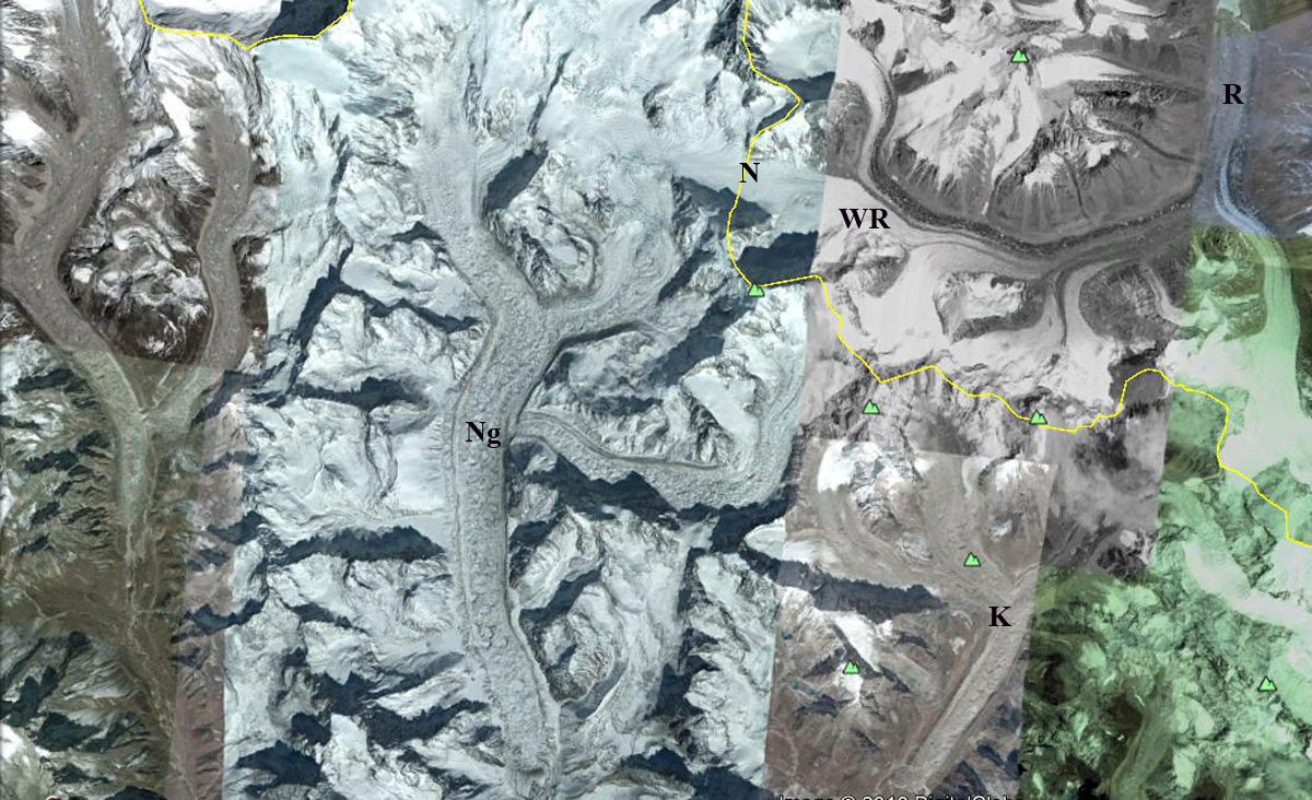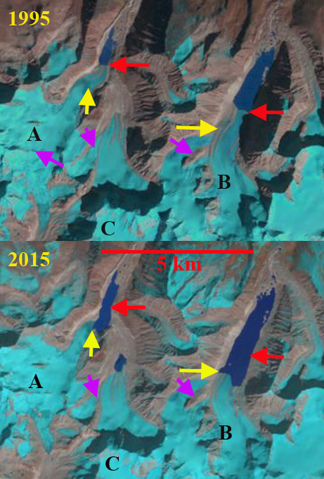 The increase in temperature has led to a tendency for snowlines to rise in the post monsoon period and remain high into the winter season on many Himalayan glaciers. In 2016 this has been the case. On October 9, 2016 a Sentinel image indicates the snowline is at 4850 m on the main trunk and on the tributary Ghanohim Glacier the snowline, while it is 4750 m on the tributaryKirti Glacier. A Landsat image from October 13th indicates the snowline on Kirti has risen to 4800 m, and remains at 4850 on the main trunk and Ghanohim Glacier. By November 30th a Landsat image indicates the snowline has risen to 5400 m on the main trunk and Ghanohim, the snowline is at 5800-5900 m on the glaciers in the Swachhand tributary valley, at 5600 m on Maiandi Glacier and 5700 m on the last tributary entering from the north. Note the impact of radiational shading is apparent on the main trunk with the snowline descending down the middle of the main trunk from 5400 m to 5100 m and on Kirti Glacier which is too dark to confidently discern the snowline. Temperatures are typically cool in December, but sunshine is common. A Sentinel image from December 8th and Landsat from Dec. 9th indicate that the snowline remains approximately the same as on Nov. 30th. The accumulation area ratio is the percentage of a glacier in the accumulation zone and is typically above 50%. On Gangotri Glacier in December 2016 the accumulation area ratio is only 20%, indicating a large mass balance deficit. High winter snowlines on Chutenjima Glacier, Tibet, from October, 2015 to February 2016. This tendency is also noted at Nup La-West Rongbuk Glacier, on the Nepal-China border, West Hongu Glacier, Nepal and Lhonak Glacier, Sikkim.