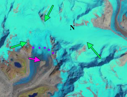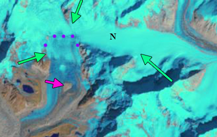 Purple dots indicate the transient snowline on Gangotri Glacier in the fall and early winter of 2016. Red arrow indicates the terminus of the glacier.